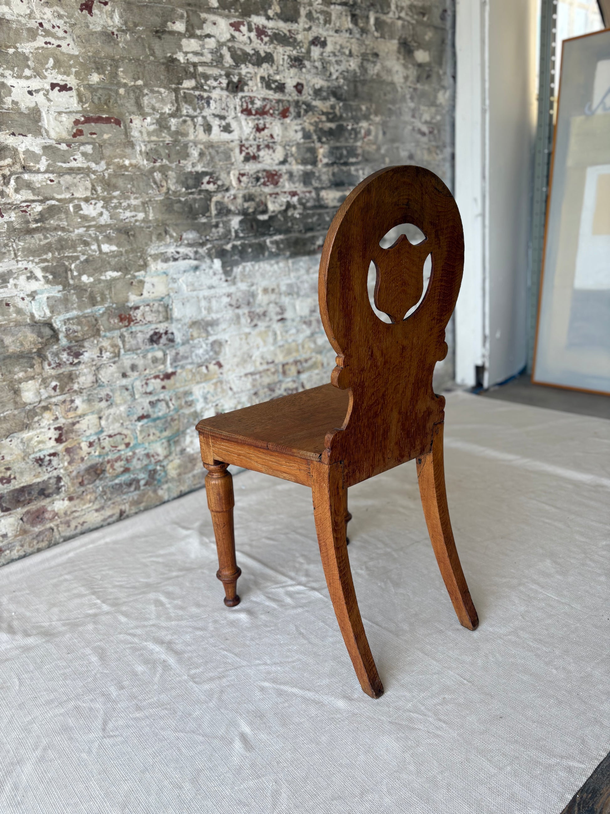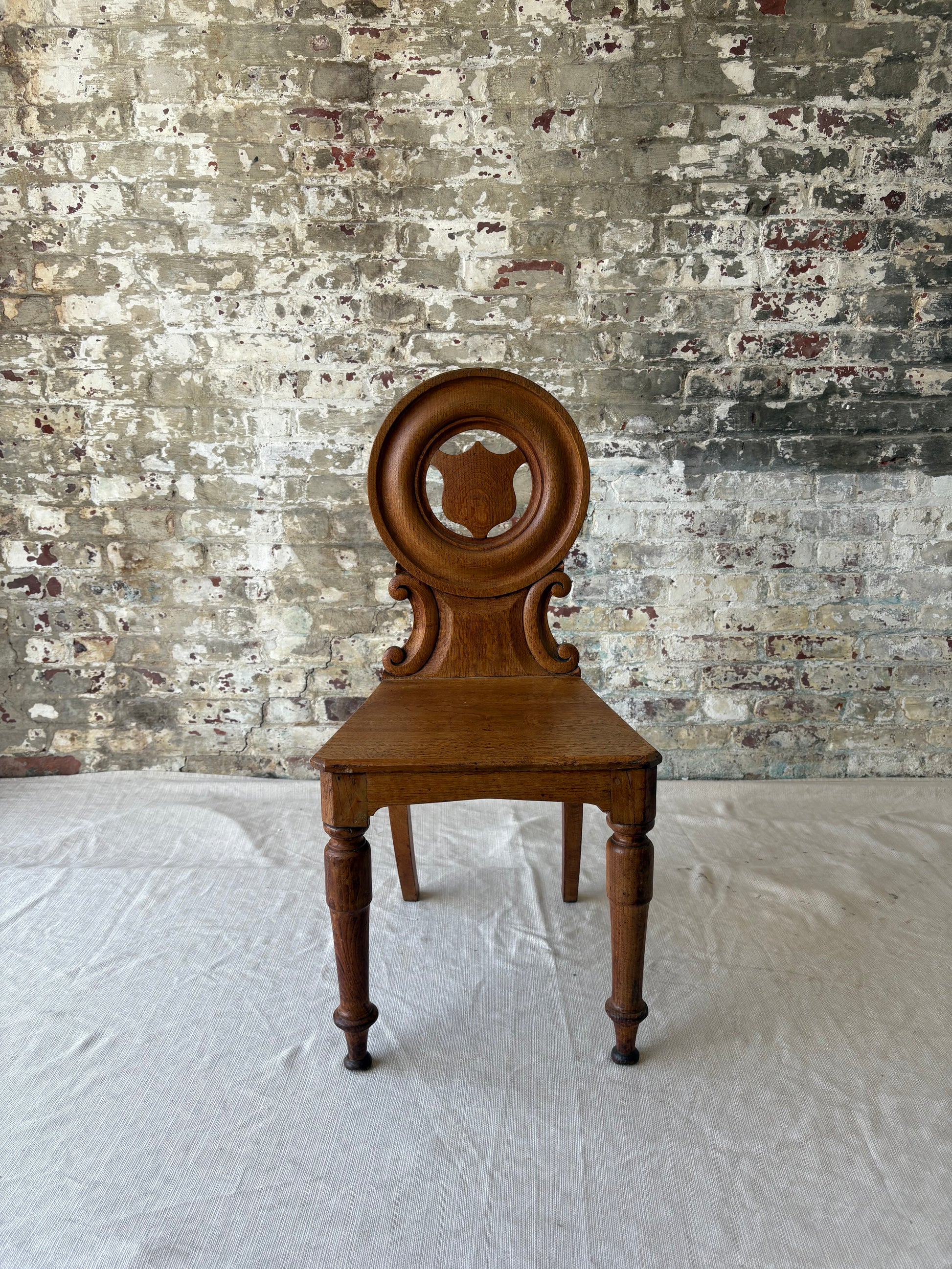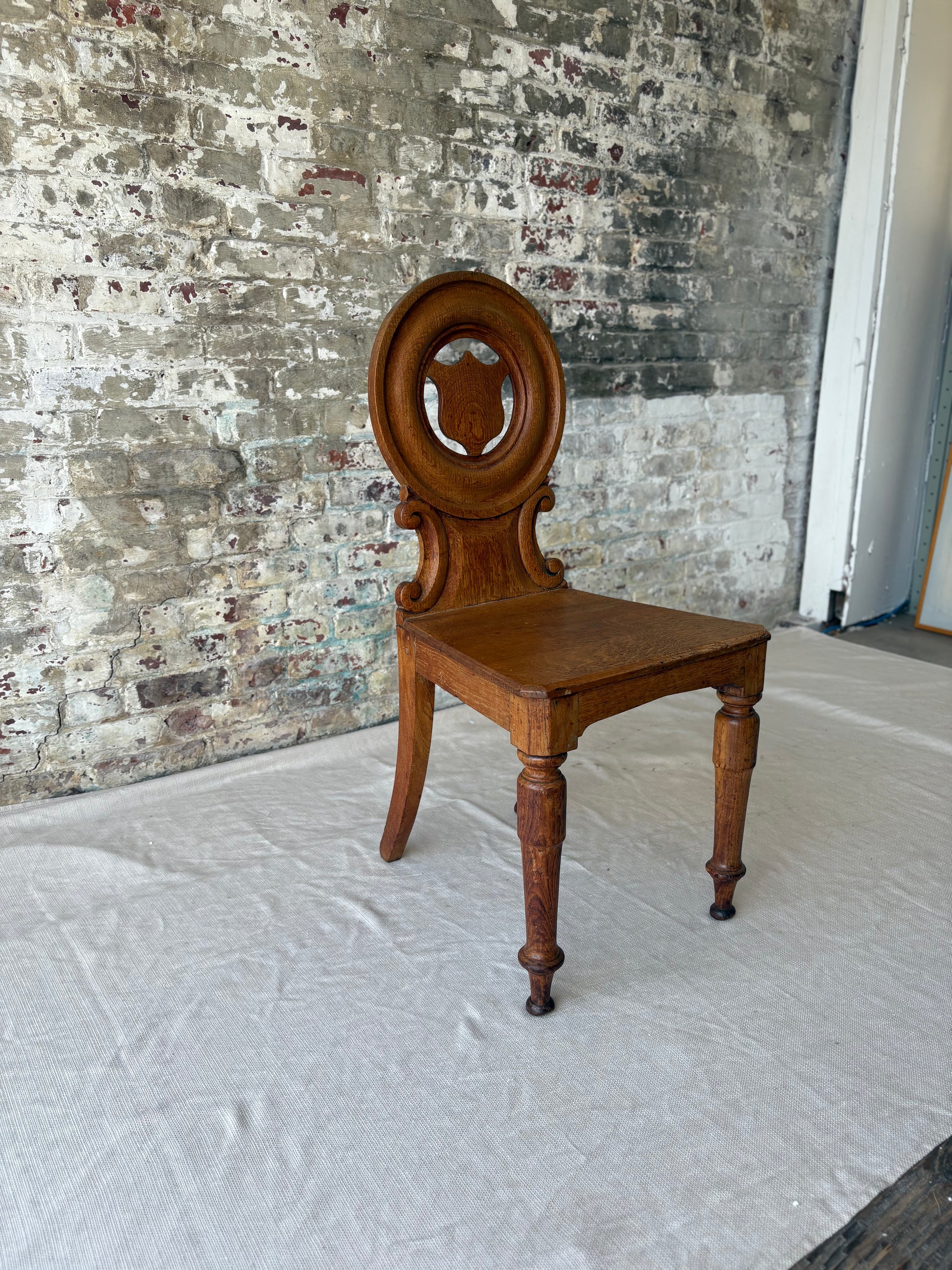A striking piece of antique craftsmanship, this 19th-century oak side chair features a bold round back with a carved shield medallion at its center, framed by elegant scrollwork and gently turned legs. The chair's sculptural presence and warm, aged patina make it a standout accent in any setting—perfect for a hallway, reading nook, or layered into an eclectic dining set.