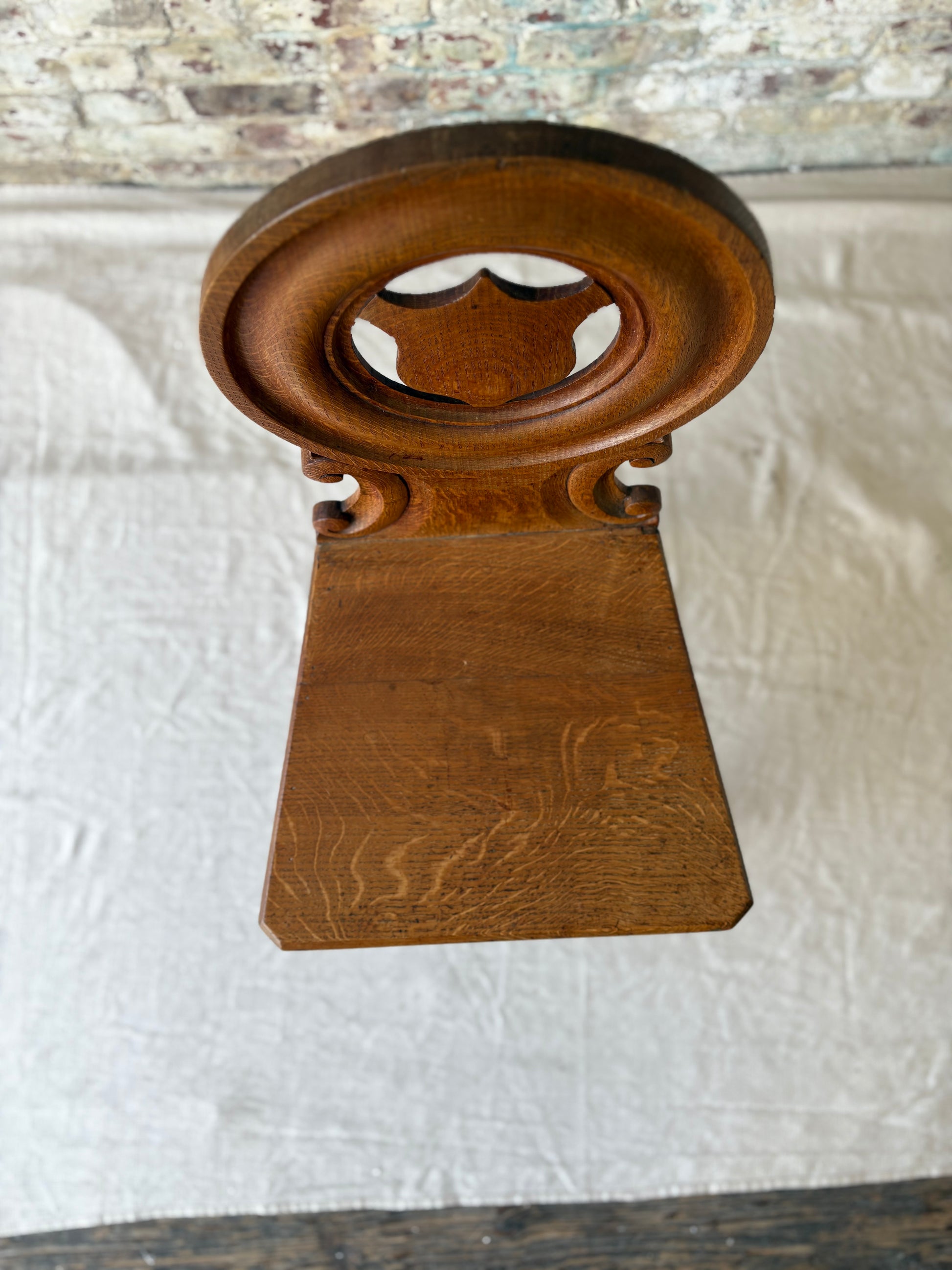 Crafted from solid oak, the grain is beautifully pronounced throughout, with subtle curves and hand-carved details that reflect its age and artistry. It’s a piece that tells a story without saying a word.