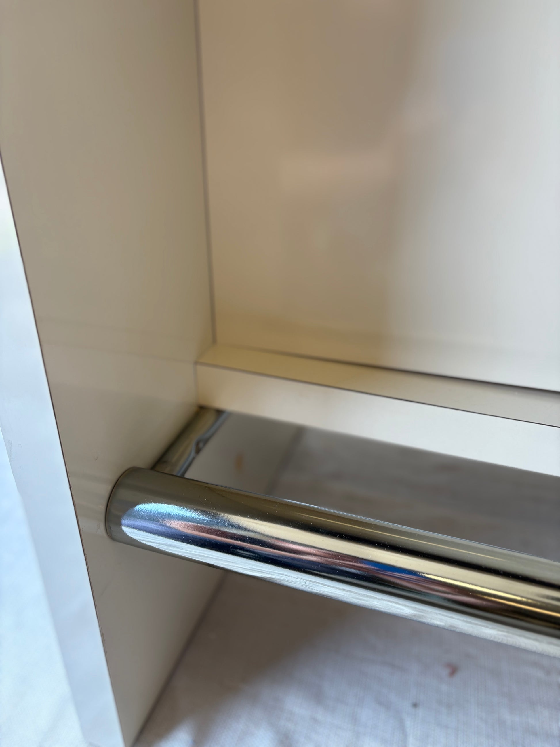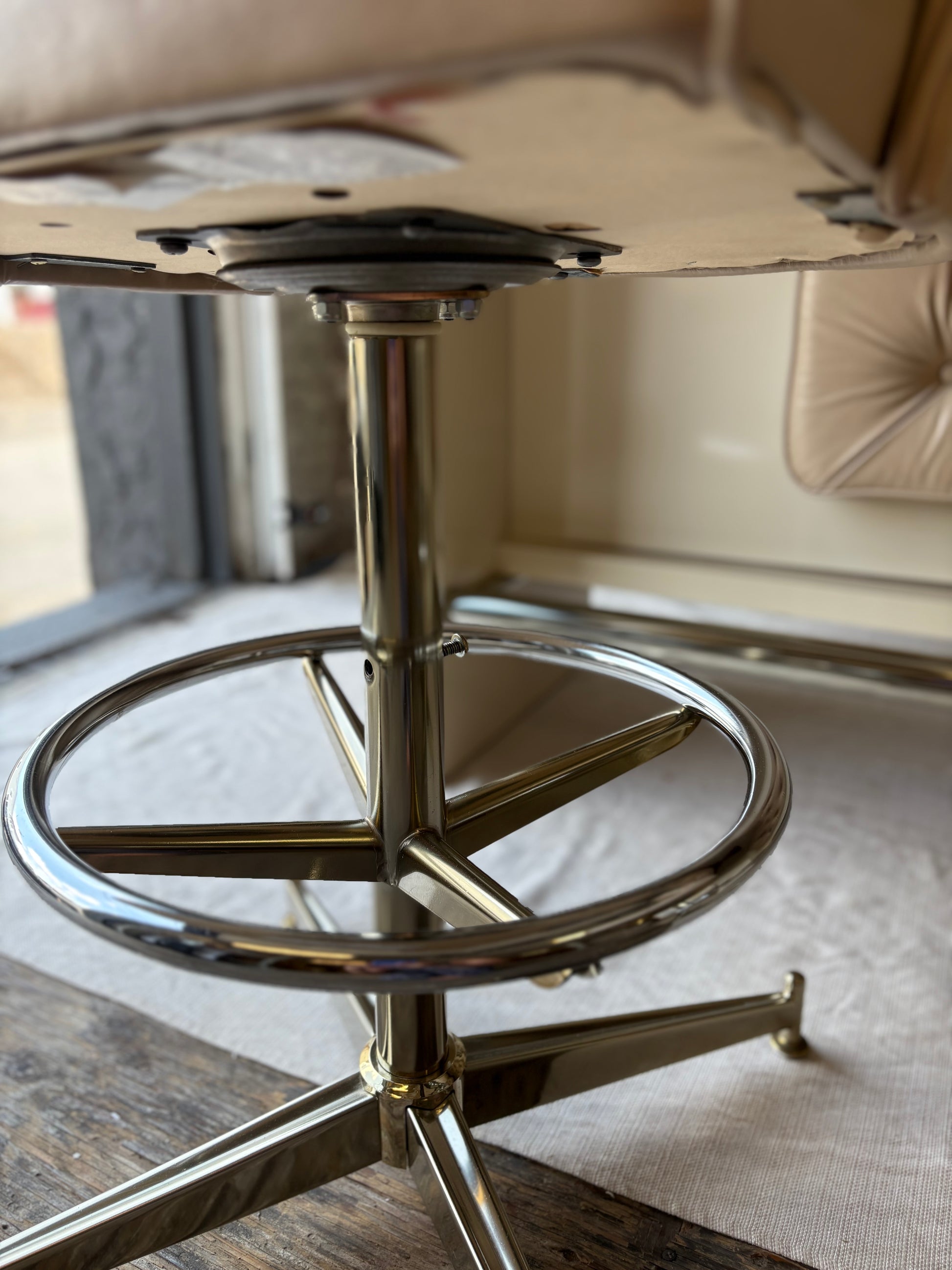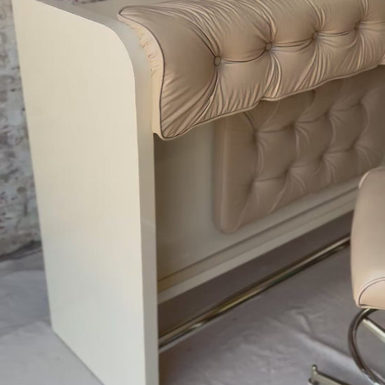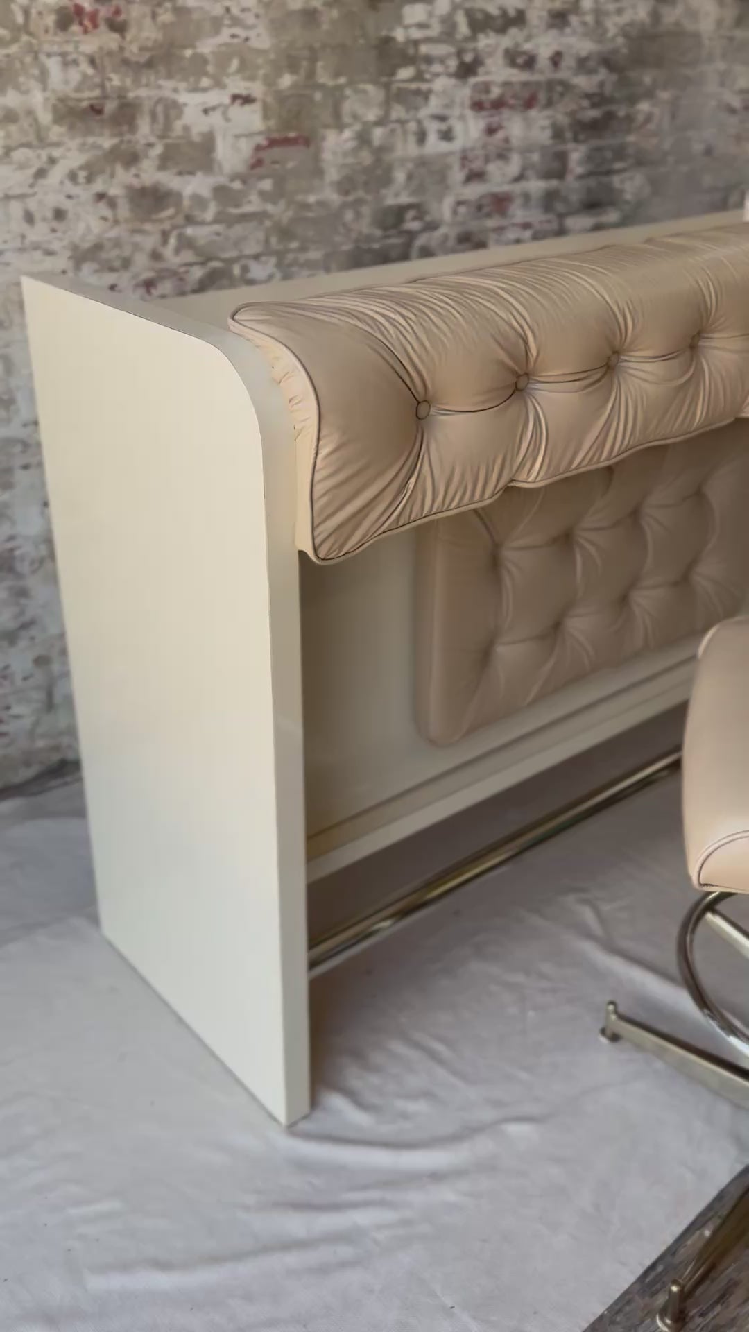Add a touch of retro sophistication to your space with this stunning vintage bar set. Featuring a sleek high-gloss lacquered bar with elegant tufted leatherette padding in warm beige, this piece is both stylish and functional. The set includes two matching mid-century swivel barstools with chrome bases and footrests, offering ultimate comfort and visual appeal.