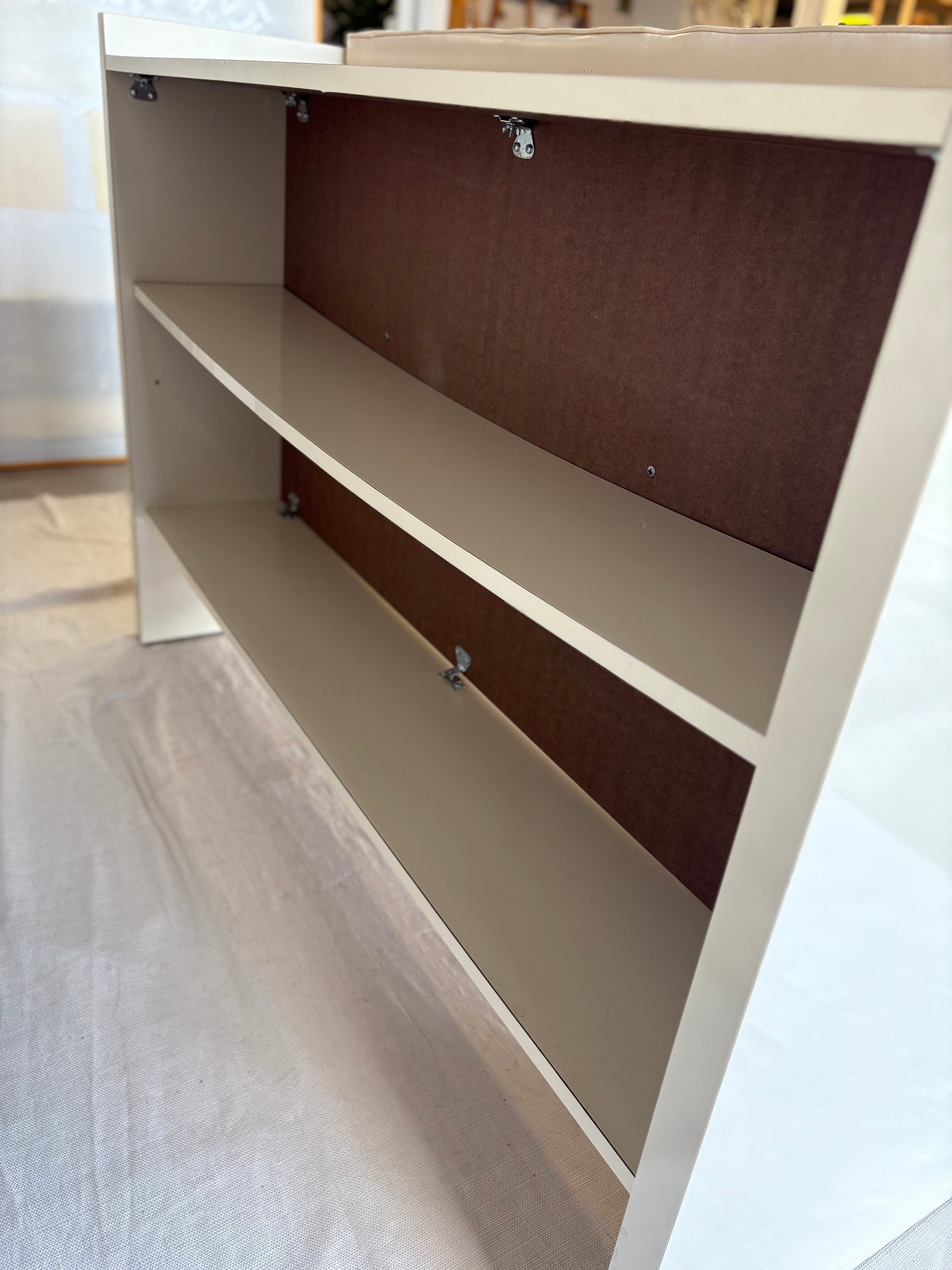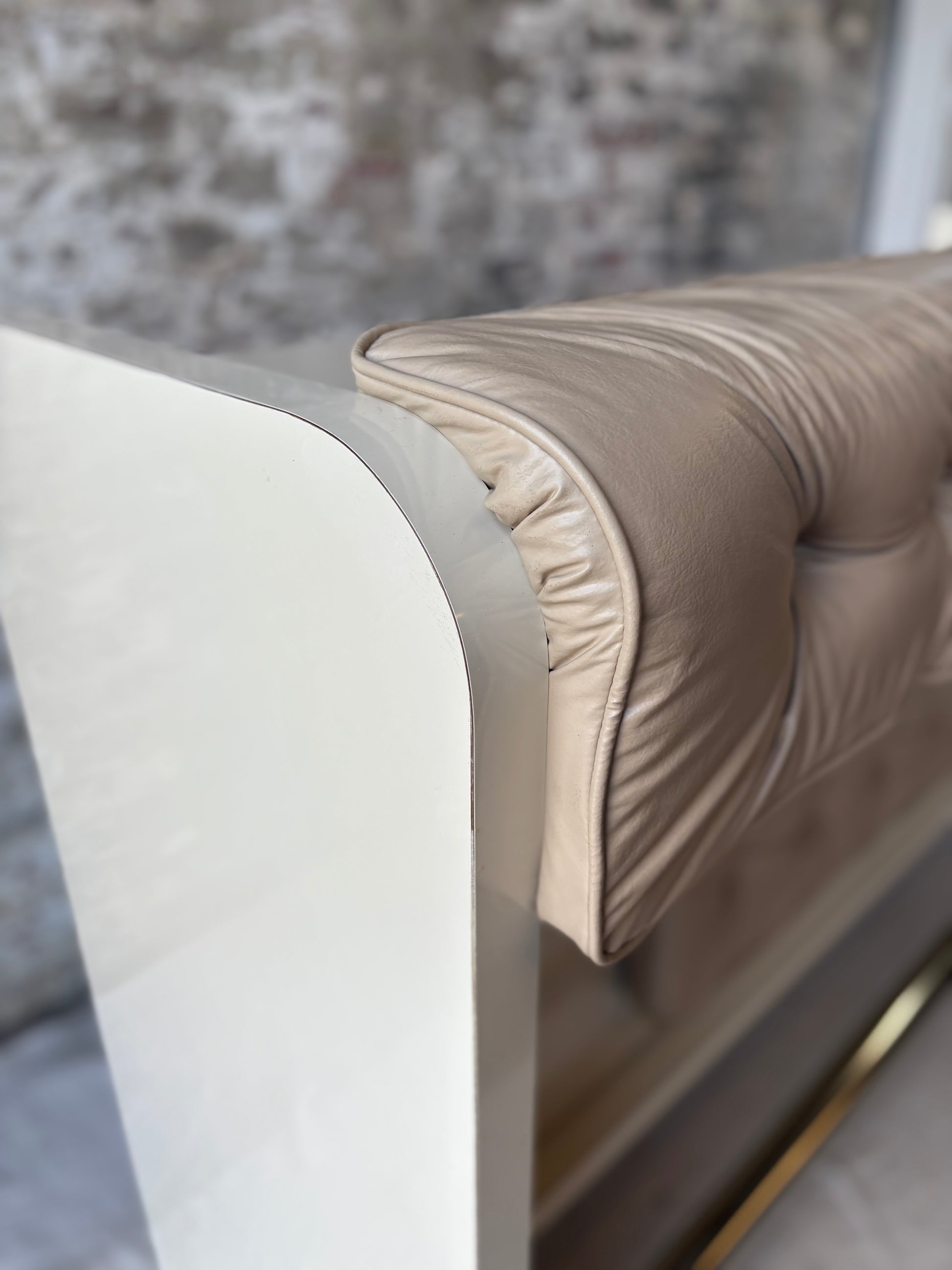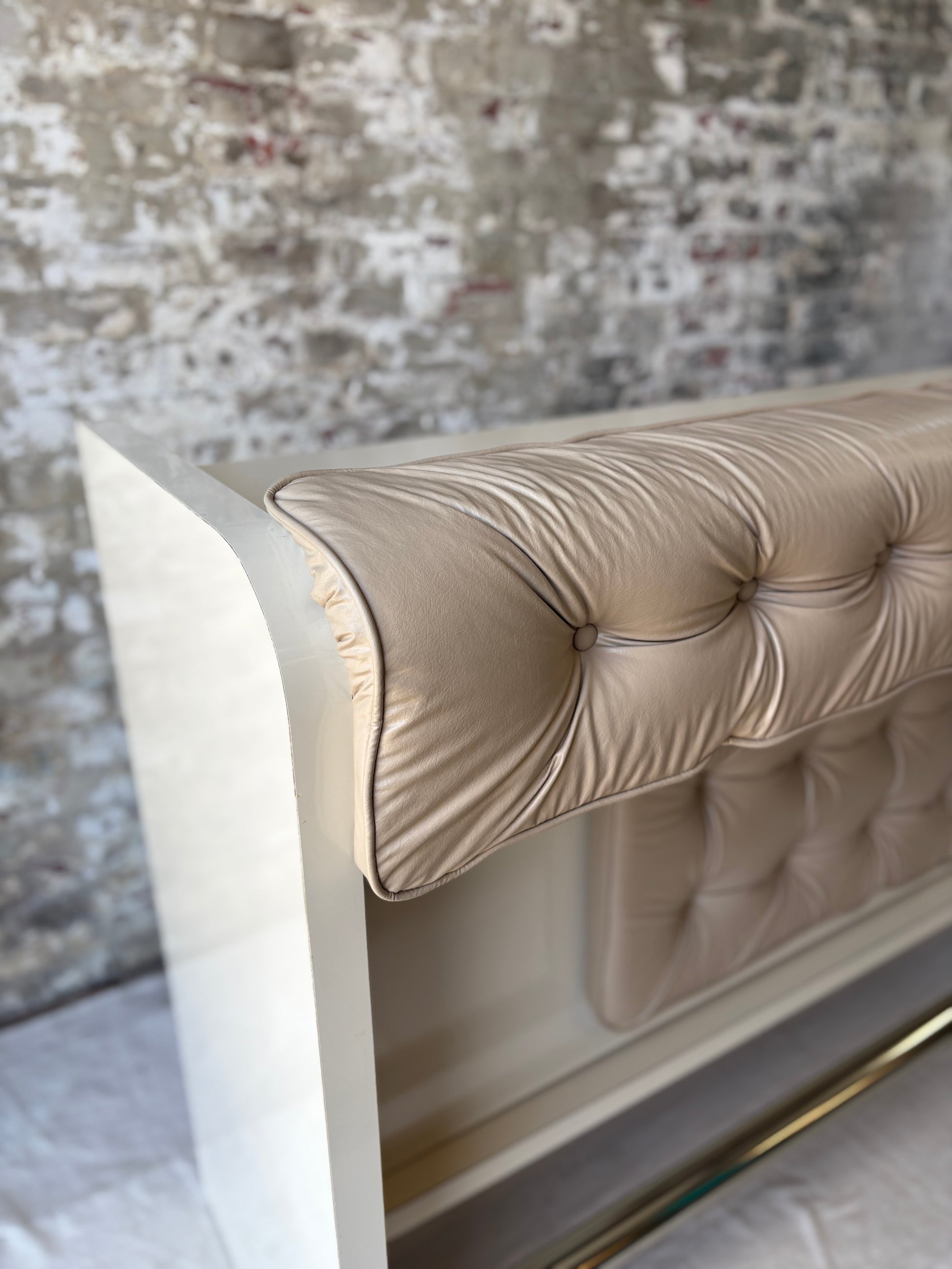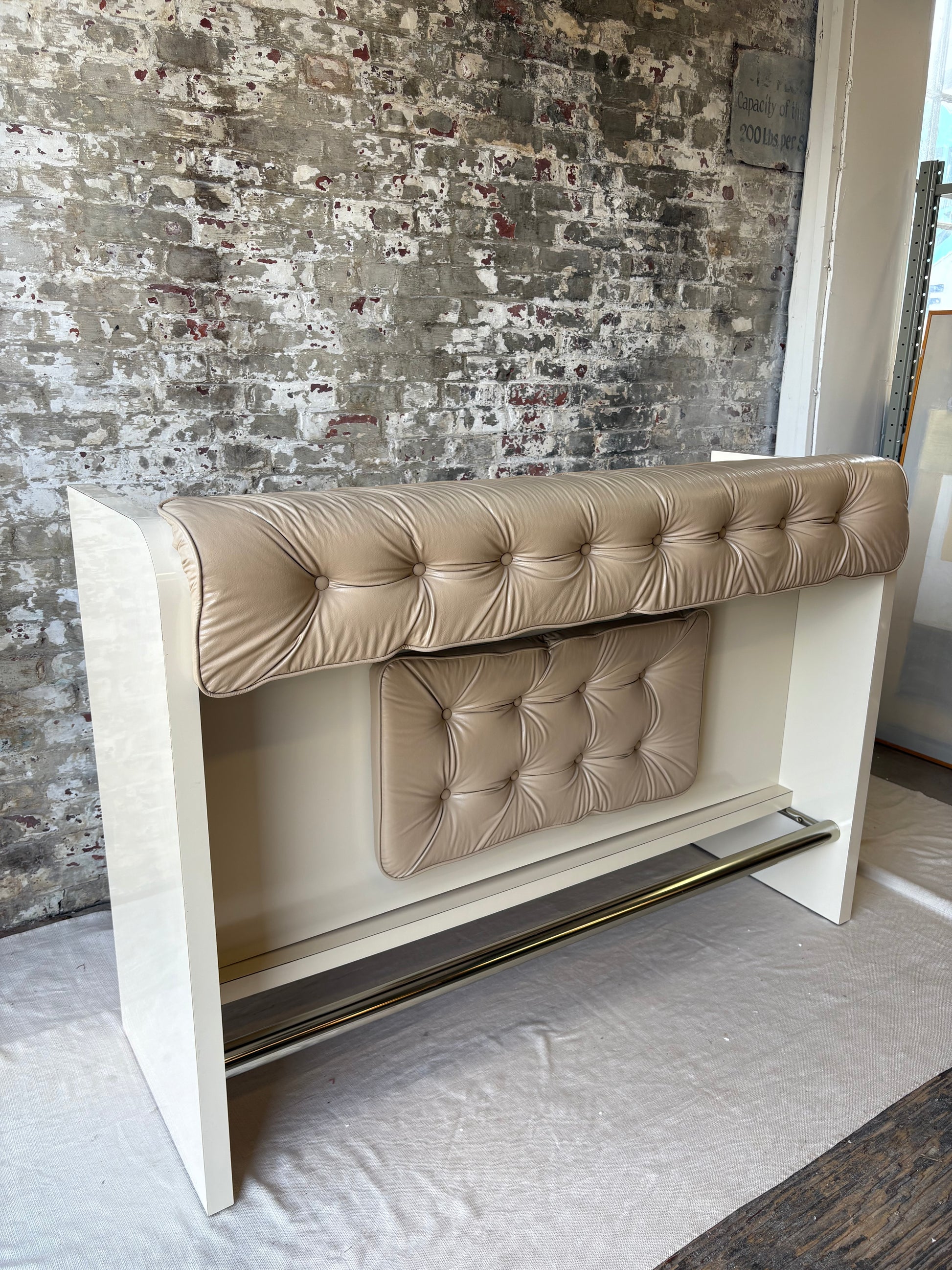 Add a touch of retro sophistication to your space with this stunning vintage bar set. Featuring a sleek high-gloss lacquered bar with elegant tufted leatherette padding in warm beige, this piece is both stylish and functional. The set includes two matching mid-century swivel barstools with chrome bases and footrests, offering ultimate comfort and visual appeal.