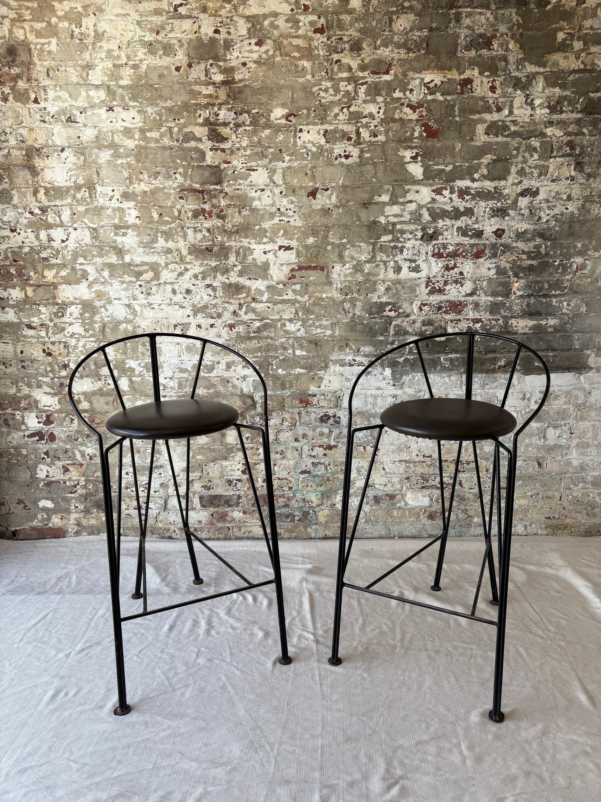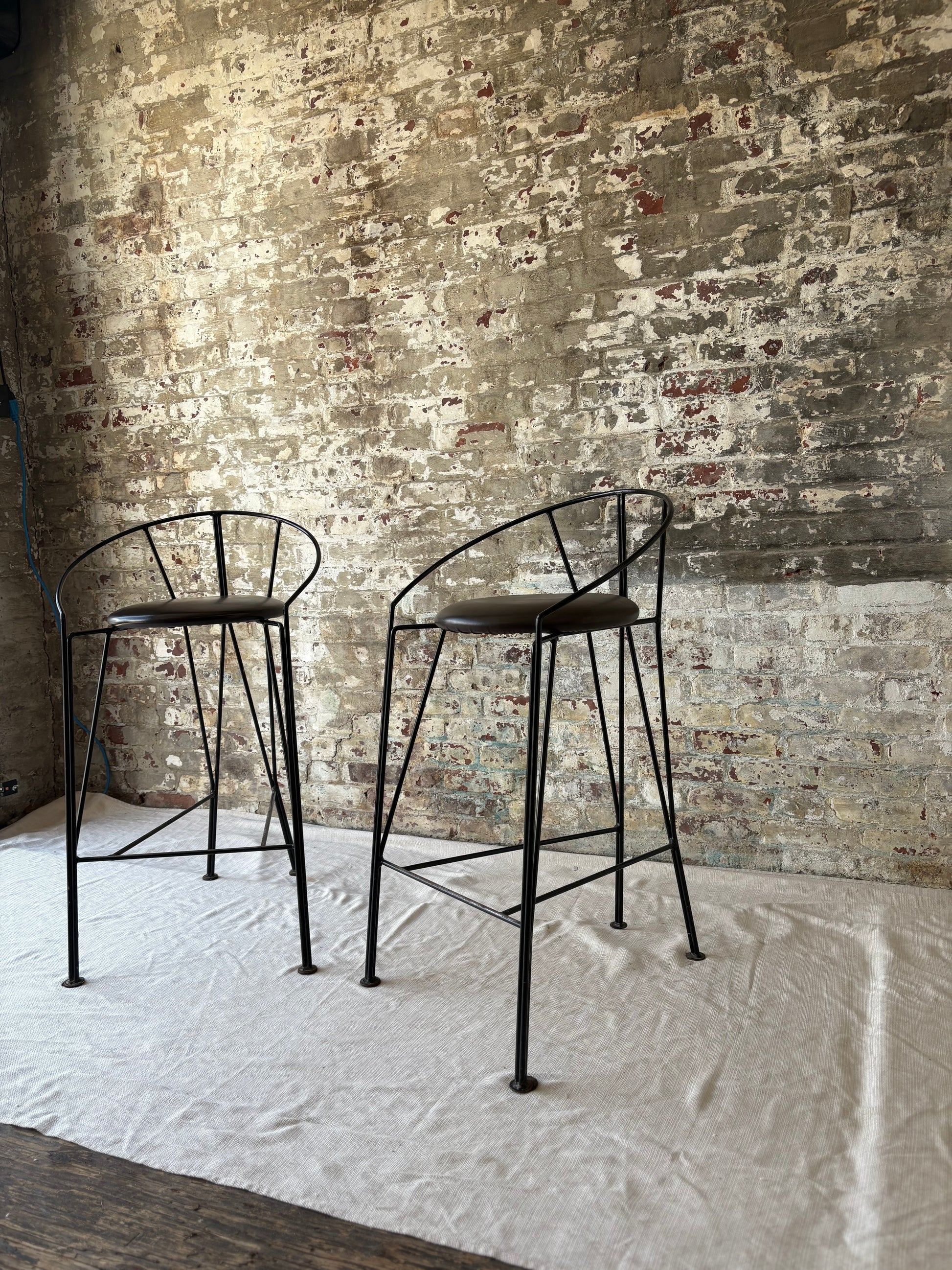 Elevate your kitchen, bar, or studio space with this striking pair of minimalist black iron bar stools. With their sleek silhouette, open spindle backs, and subtly contoured seats, these stools deliver both style and function in a refined, industrial-inspired form.