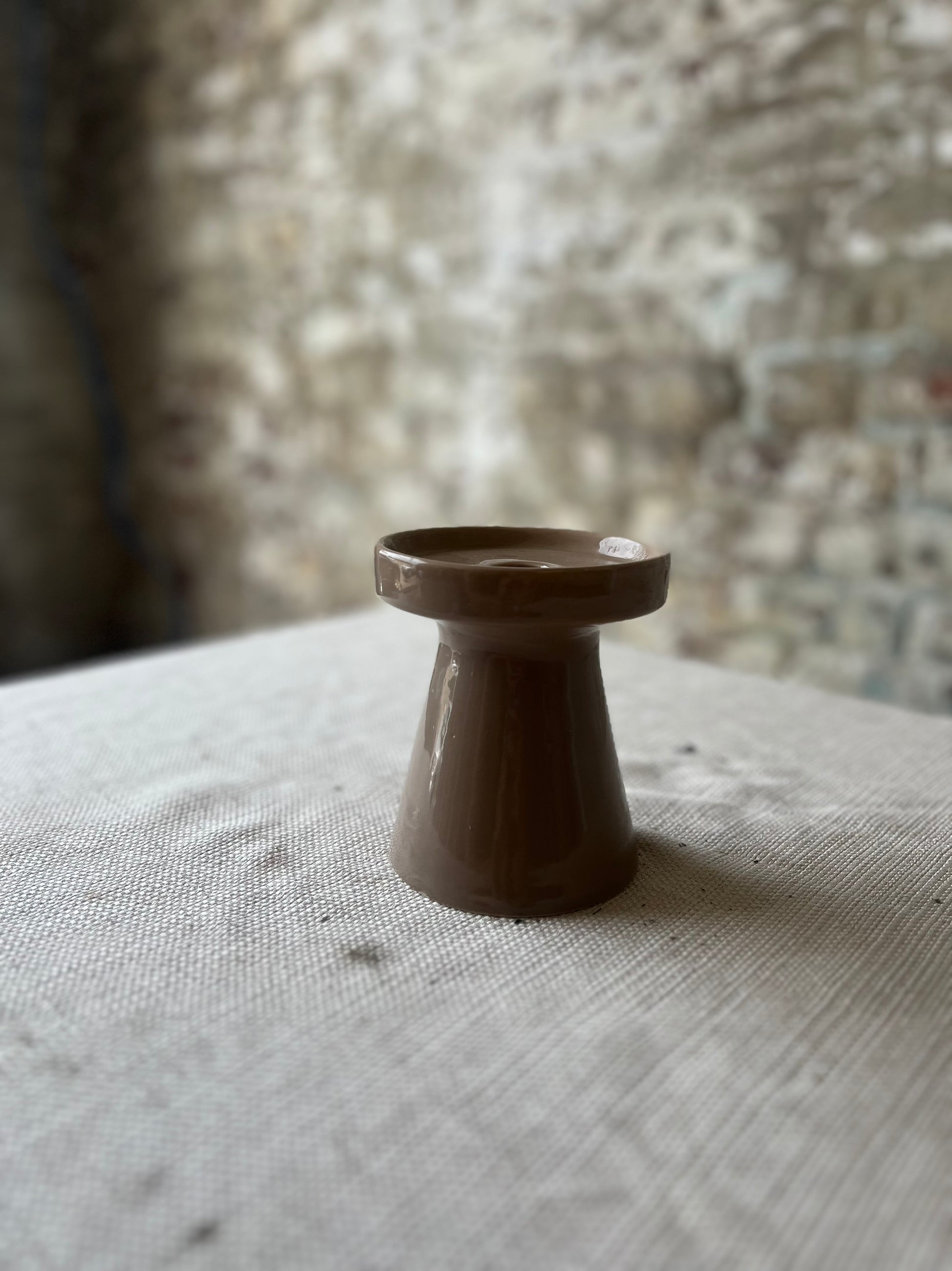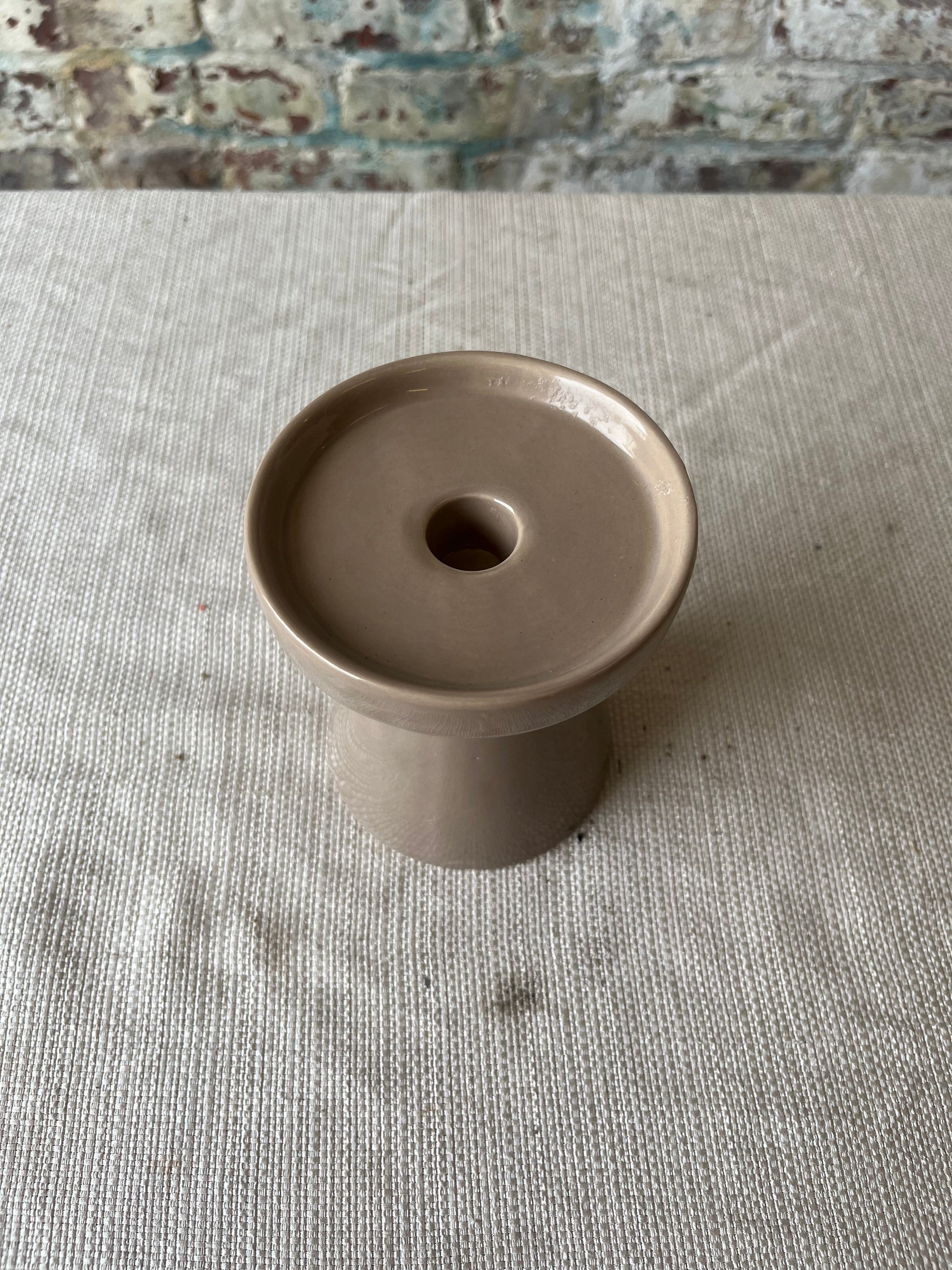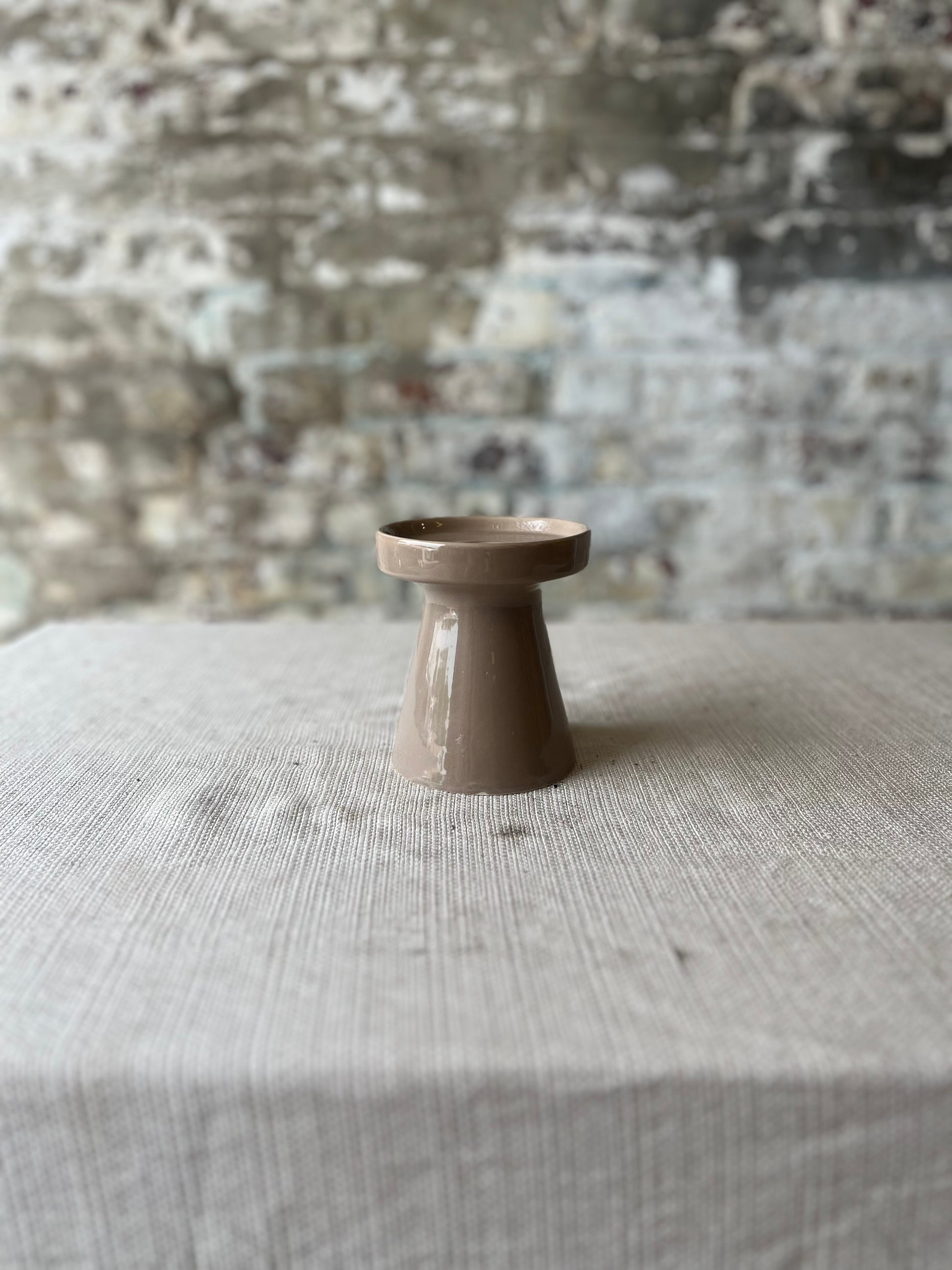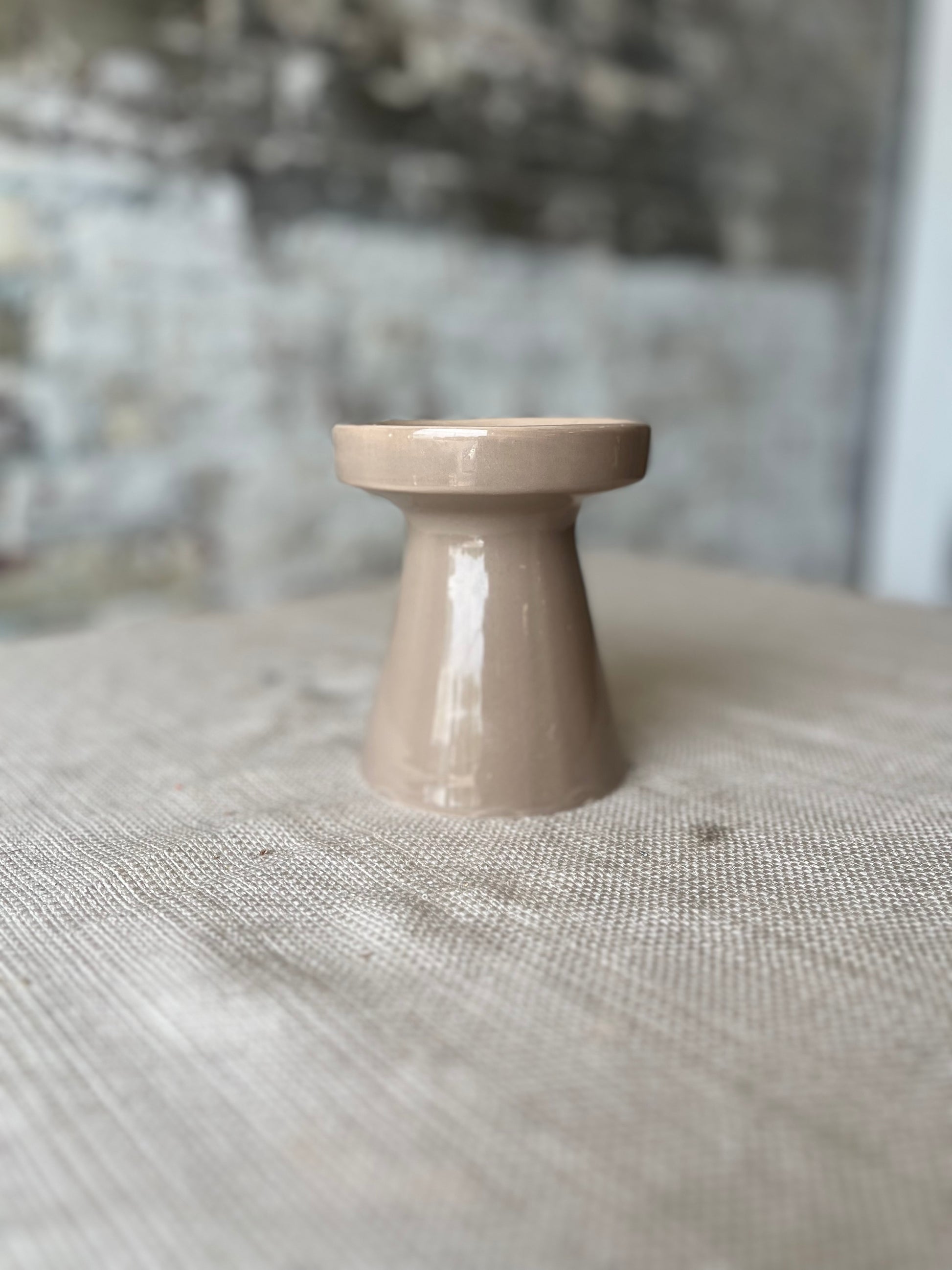 Elevate your tabletop decor with this elegant, sculptural candle holder crafted from high-gloss glazed ceramic. Featuring a minimalist silhouette with a flared base and slightly raised rim, this piece brings both stability and subtle drama to your vignette. The neutral taupe tone complements a wide range of styles, from contemporary to boho and earthy interiors.