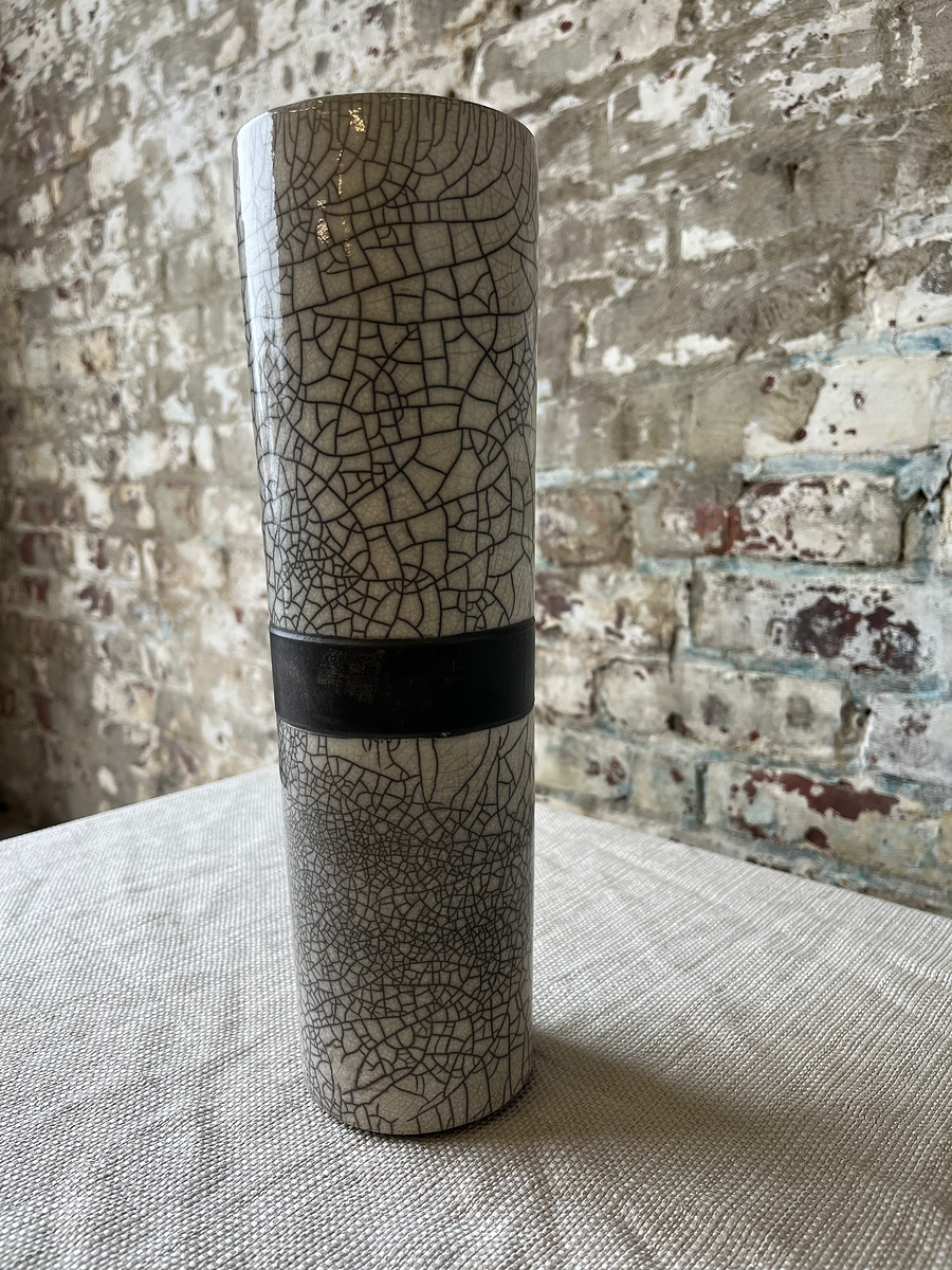 Crackle-Glazed Tall Cylinder Vase with Black Band