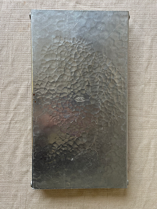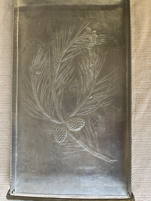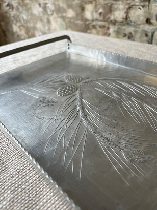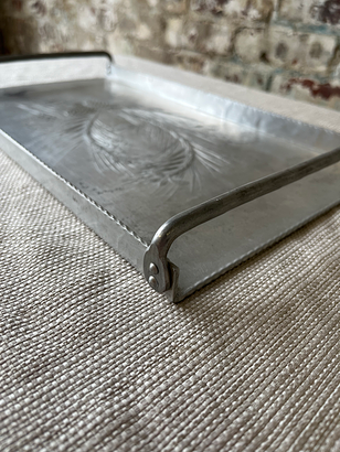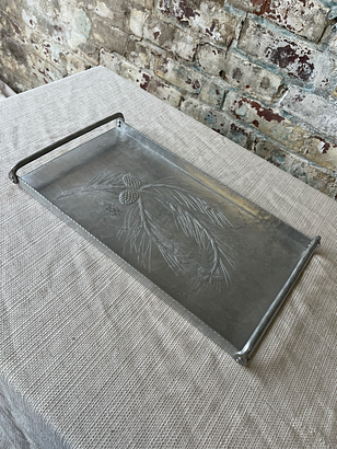 Bring a touch of rugged elegance to your space with this vintage metal tray, featuring an etched pine branch and pinecone motif. The sturdy construction and industrial-style handles make it perfect for serving drinks, organizing barware, or styling with candles and greenery. A unique accent for cabin-inspired decor, holiday entertaining, or year-round display.