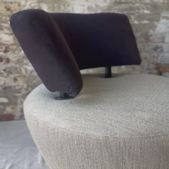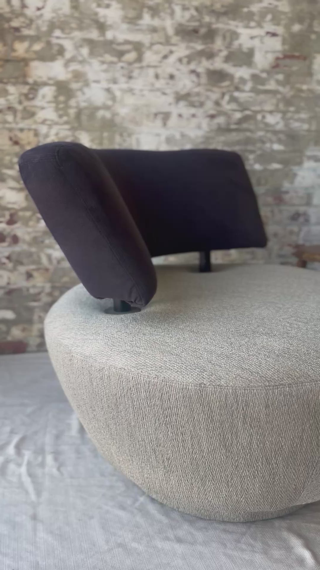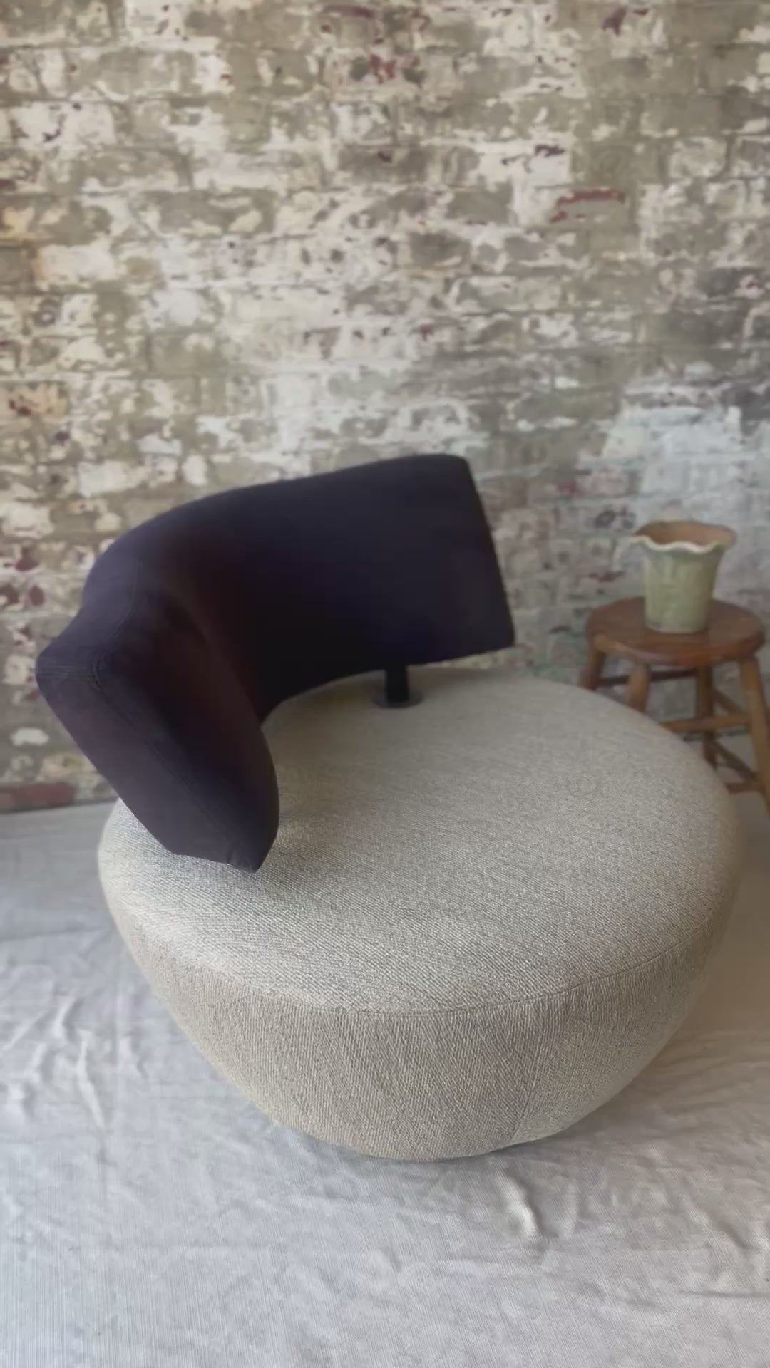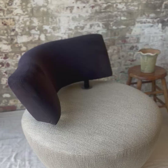 These chairs feature generous, rounded bases with softly sloped profiles upholstered in a neutral woven fabric, perfectly balanced by dramatic floating curved backrests in a deep charcoal or black upholstery. The backs are mounted on sleek black supports that enhance the floating effect while offering comfortable, flexible lounging.