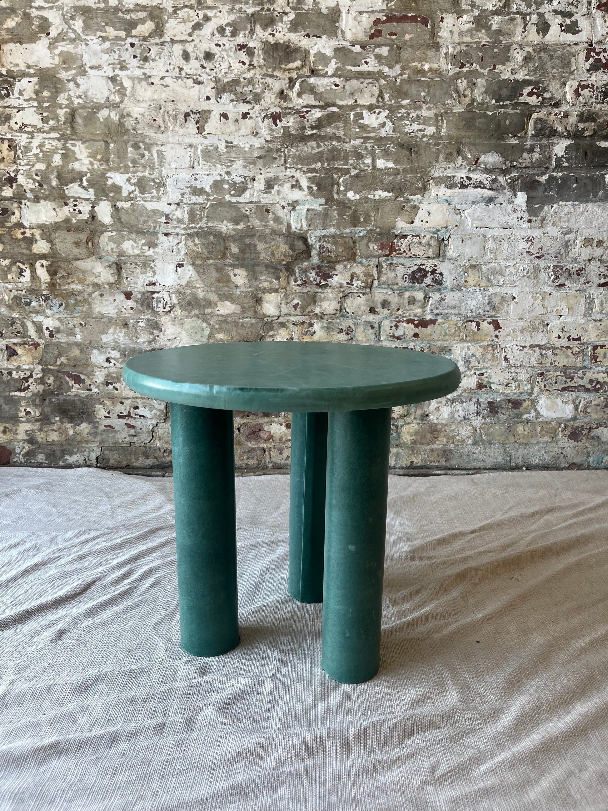Elevate your space with this distinctive leather-wrapped side table in a dreamy soft green hue. With its minimalist round top and three bold cylindrical legs, this piece strikes a perfect balance between sculptural statement and functional form.