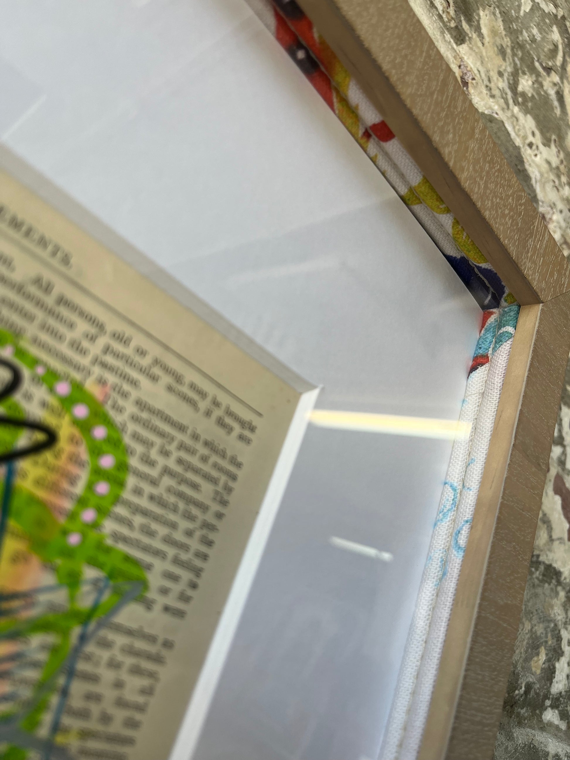 This one-of-a-kind mixed media artwork is created on a vintage book page from a 19th-century publication, adding historical texture to its unapologetically modern message. With vibrant layers of paint pen, marker, and graffiti-style scrawls, the piece centers on a surreal, whimsically dressed character in motion—urging us to let shit go.