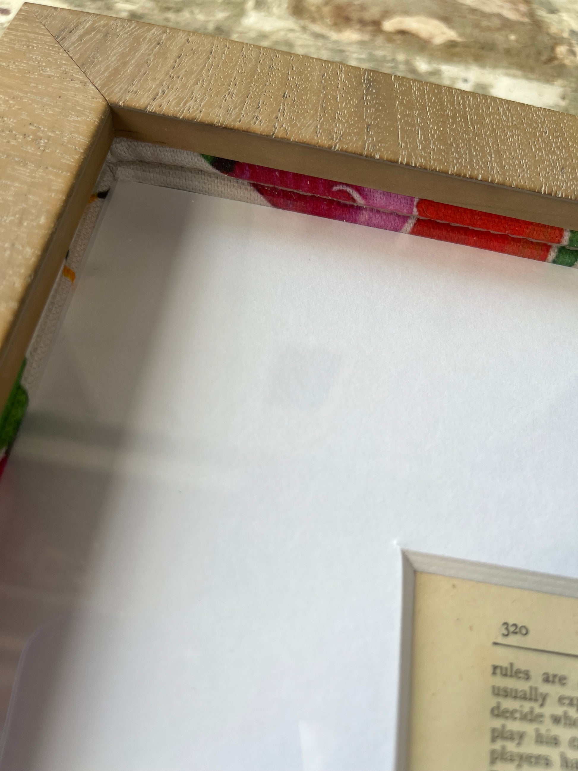 Frame: Custom wood float frame with bright textile backing (visible at edges)