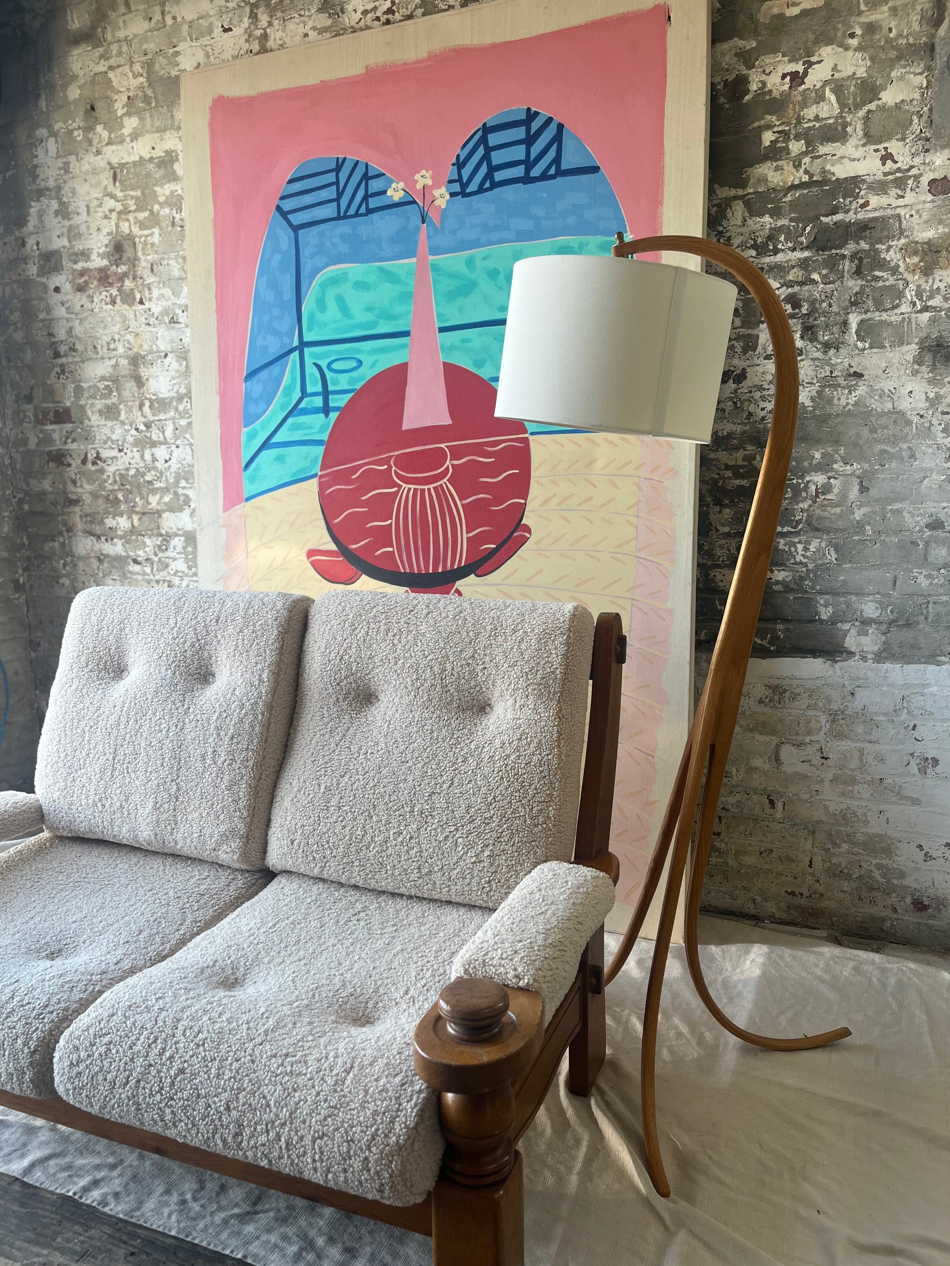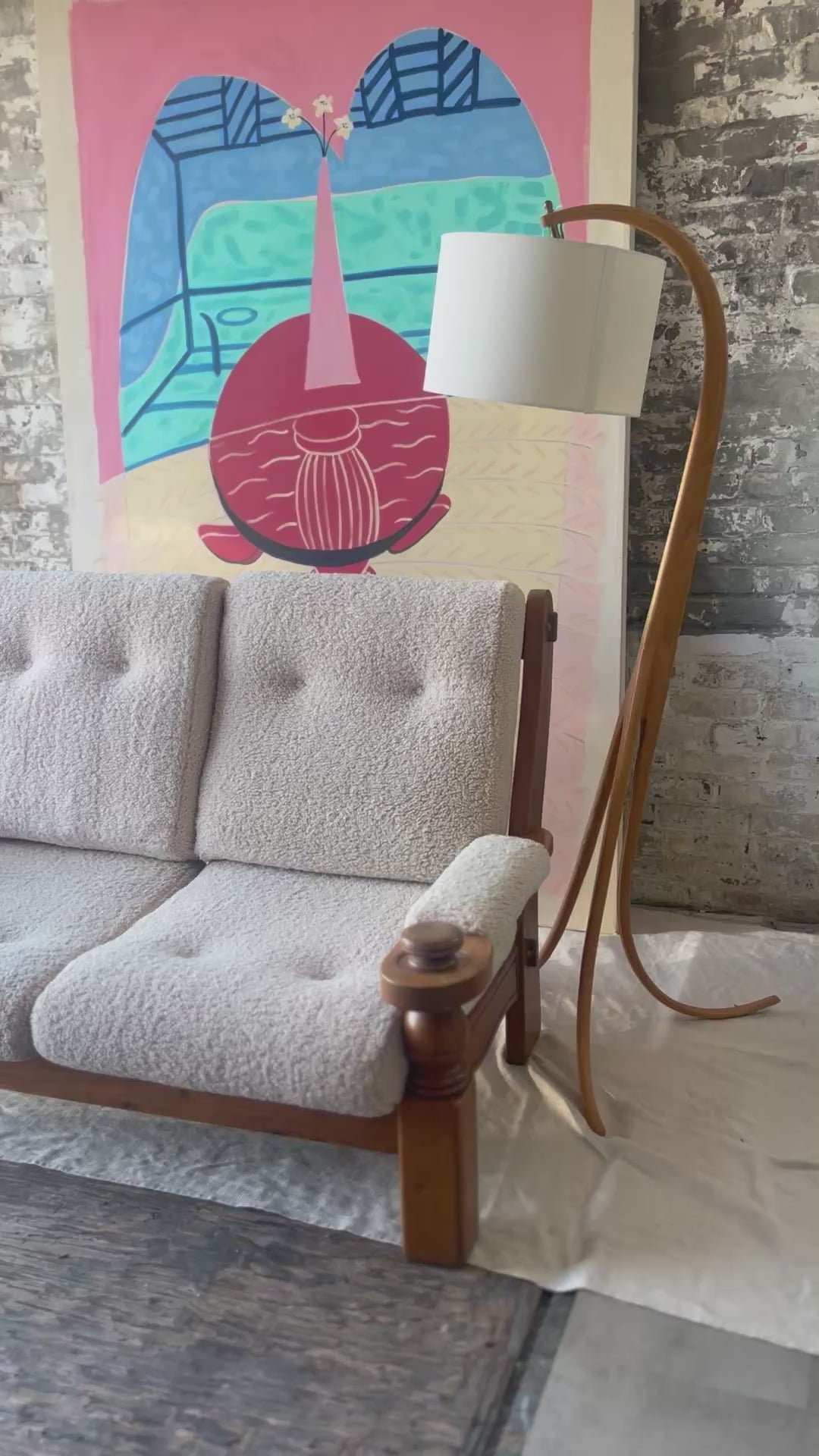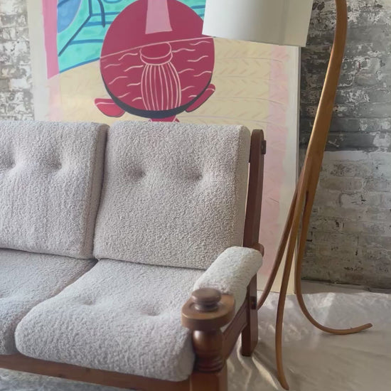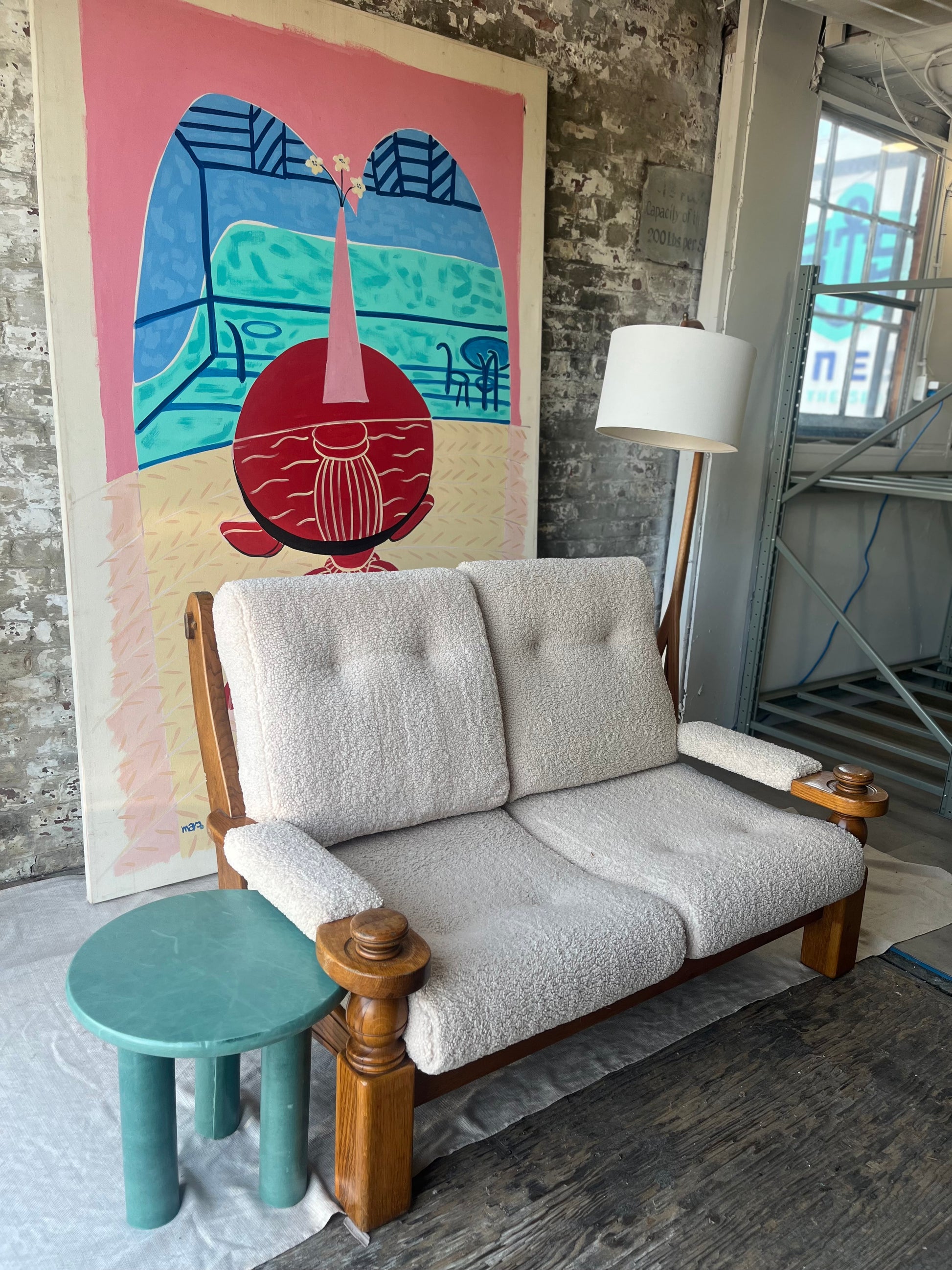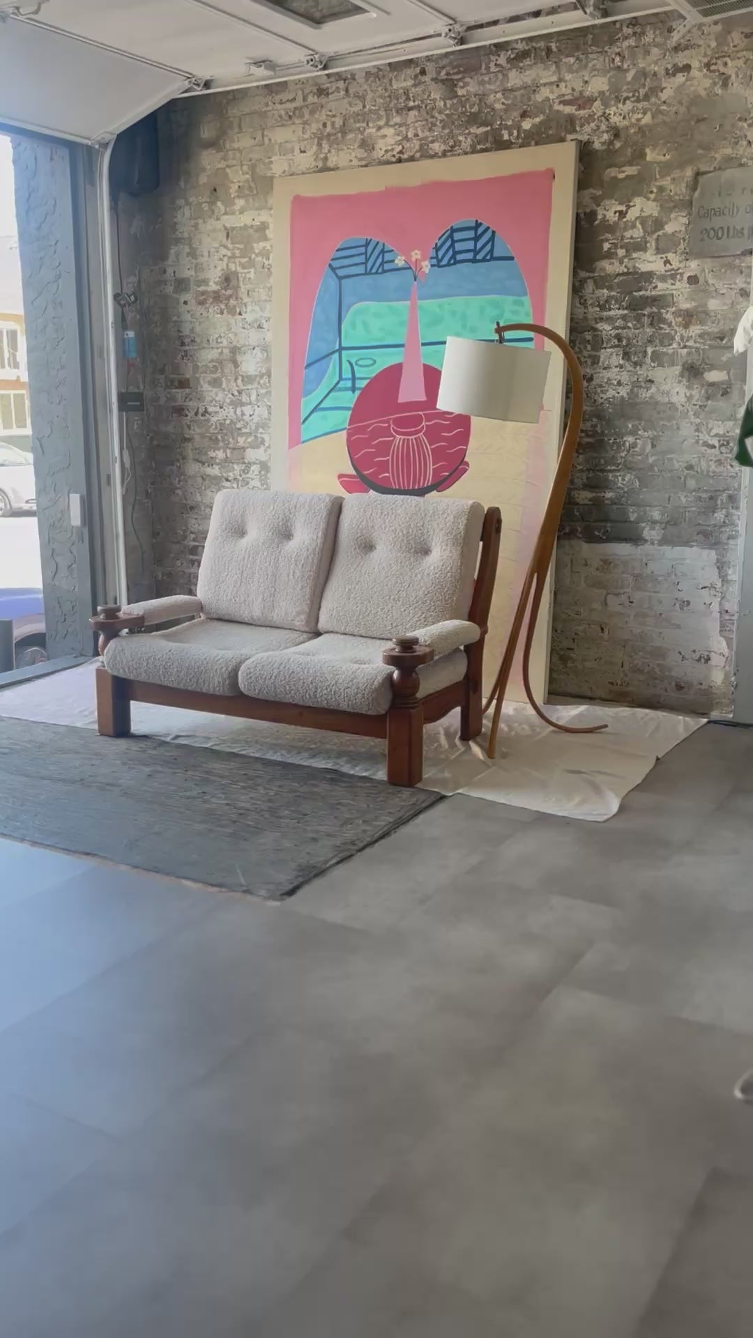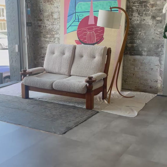 This stunning Mid-Century Modern loveseat is the perfect blend of timeless style and cozy texture. Featuring a richly grained, sculptural wood frame and freshly upholstered bouclé cushions, it offers both visual impact and luxurious comfort.
