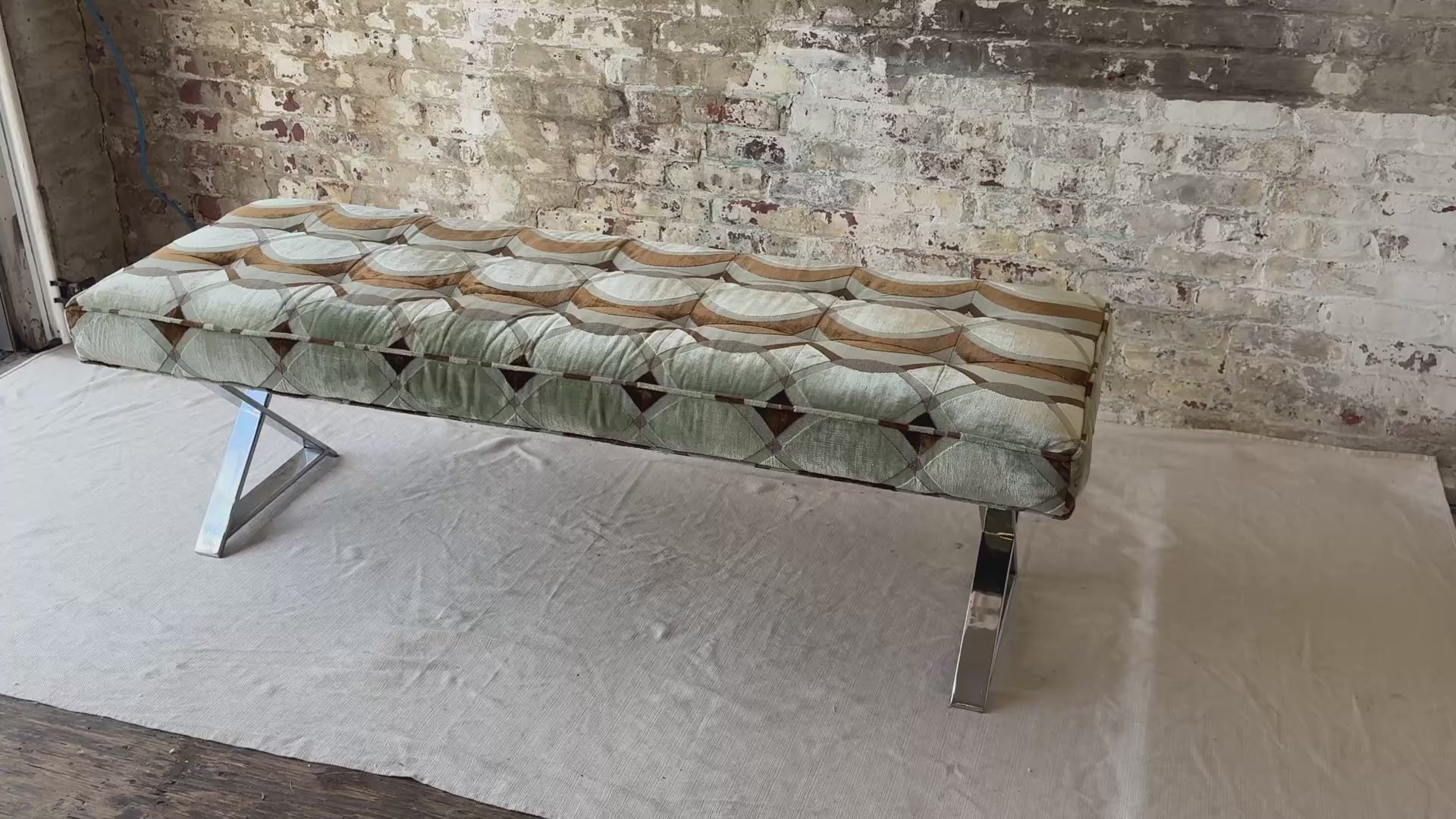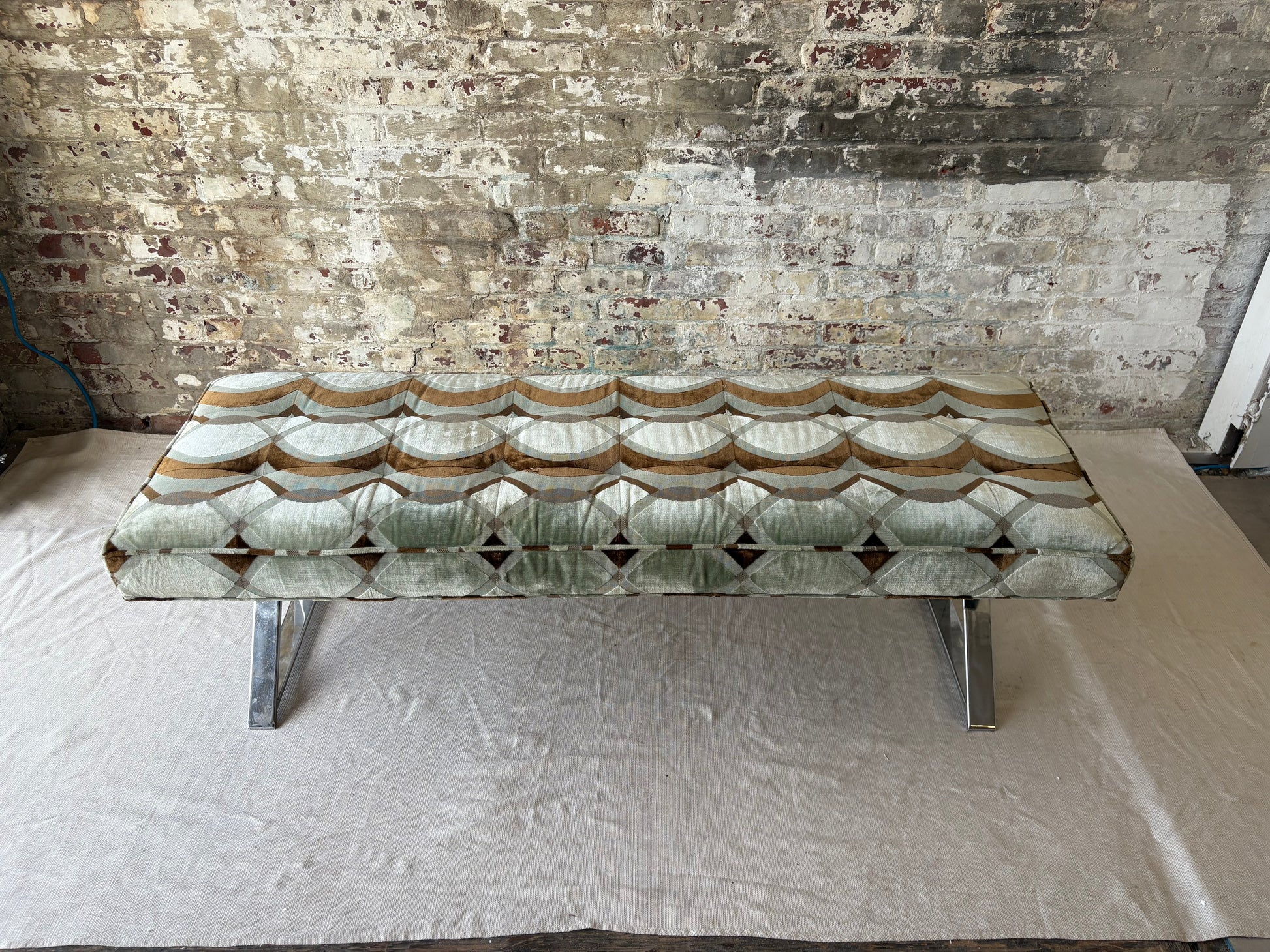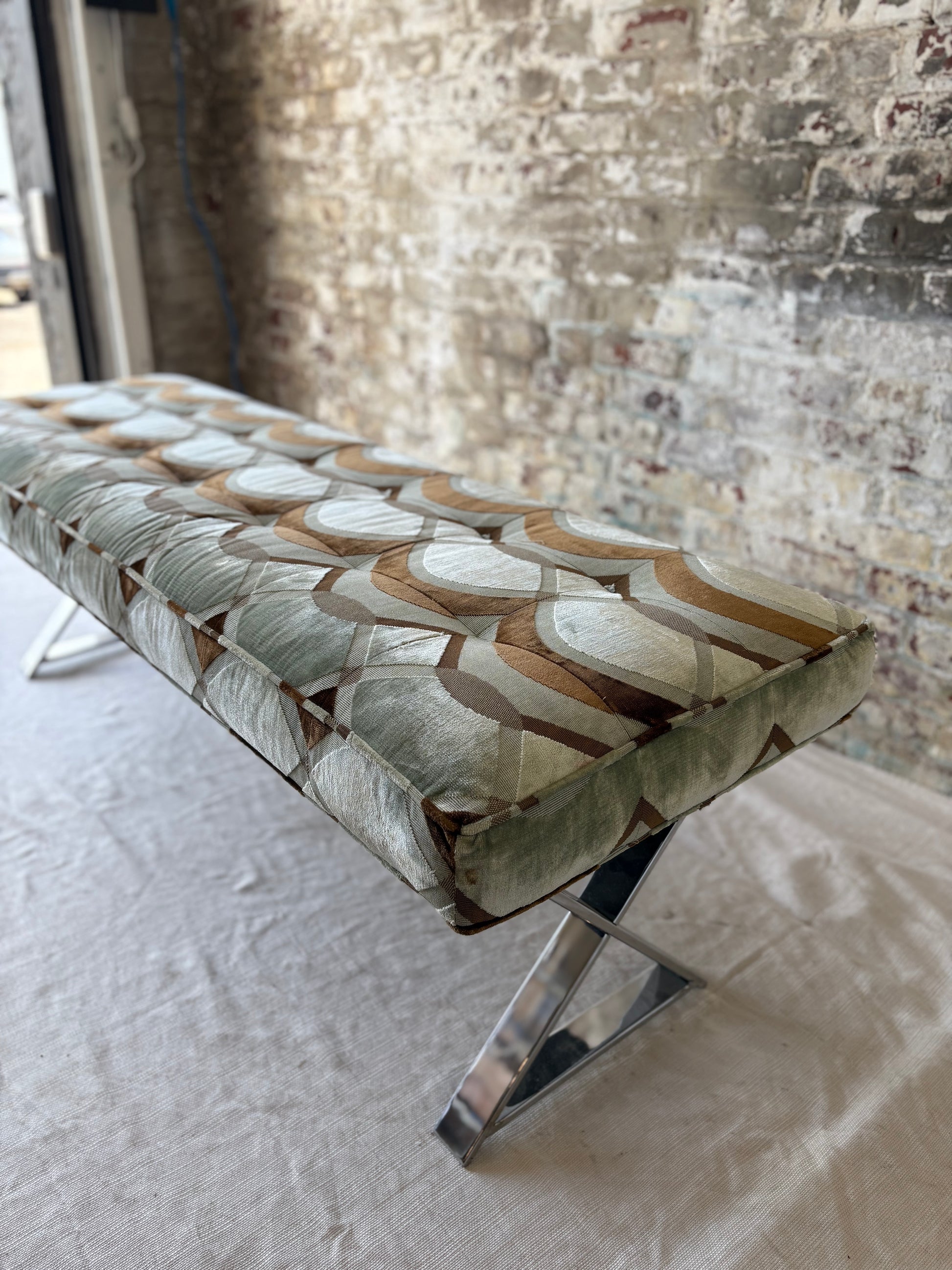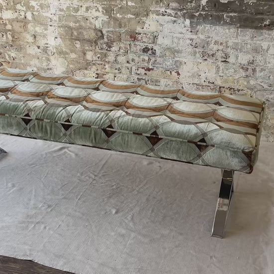 Make a bold statement with this eye-catching vintage bench, featuring a plush tufted seat in a geometric patterned fabric and sleek, angular chrome legs. The blend of retro upholstery and modern metallic base makes it a standout piece for any room.
