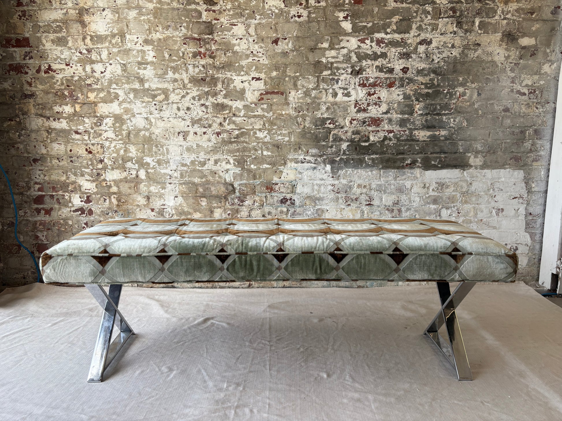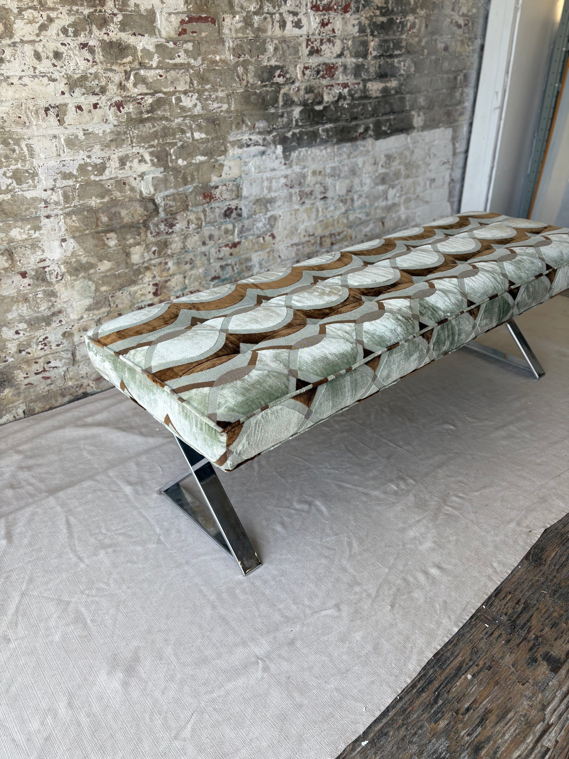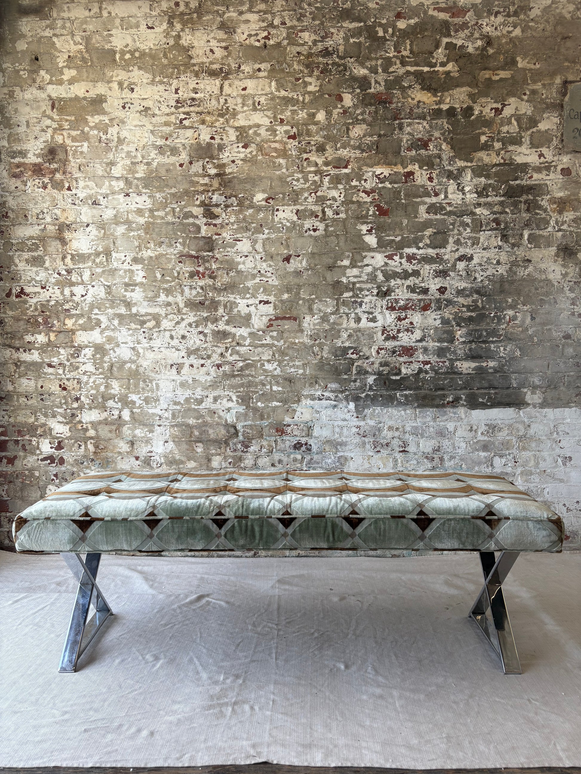 Make a bold statement with this eye-catching vintage bench, featuring a plush tufted seat in a geometric patterned fabric and sleek, angular chrome legs. The blend of retro upholstery and modern metallic base makes it a standout piece for any room.