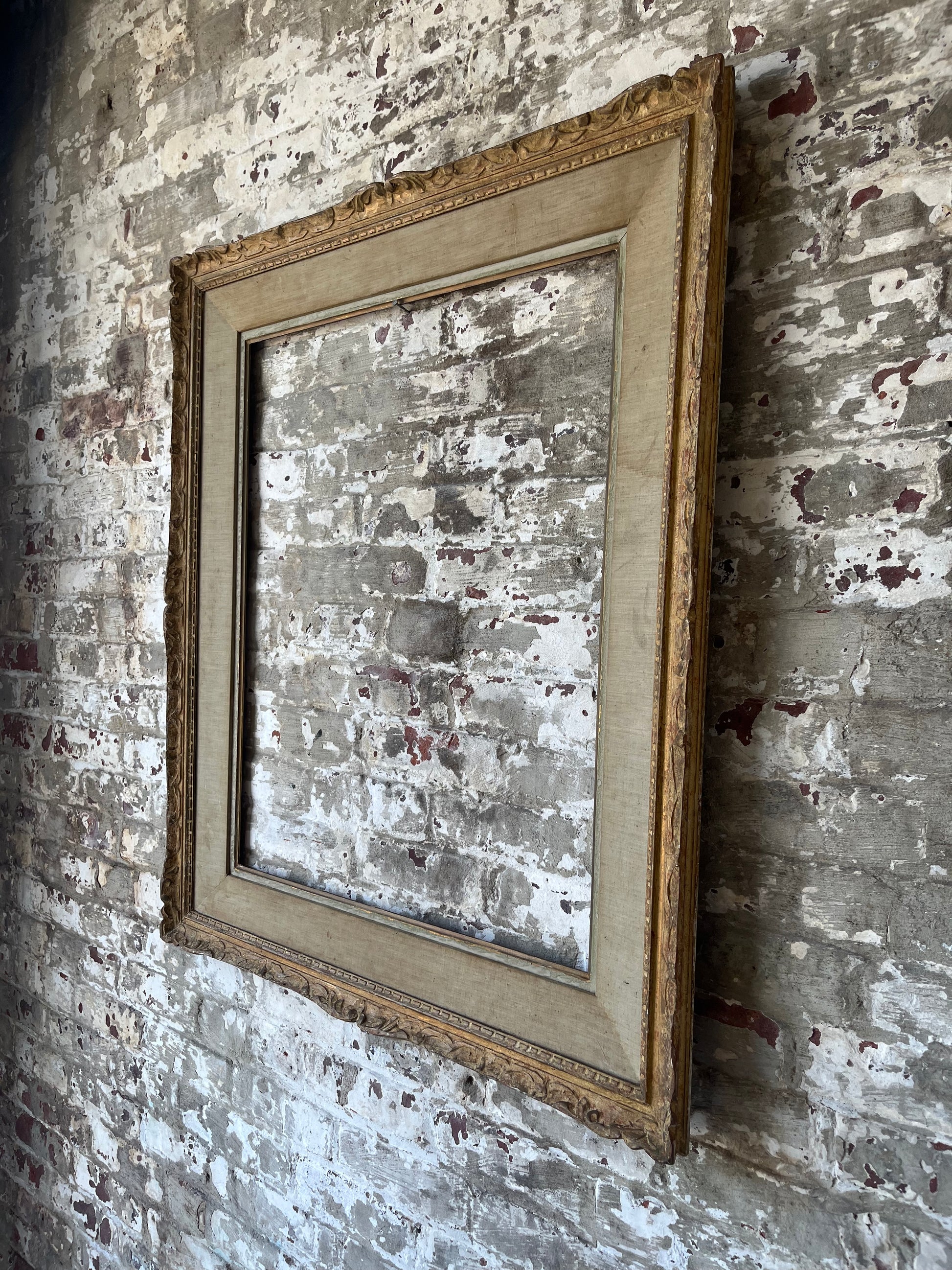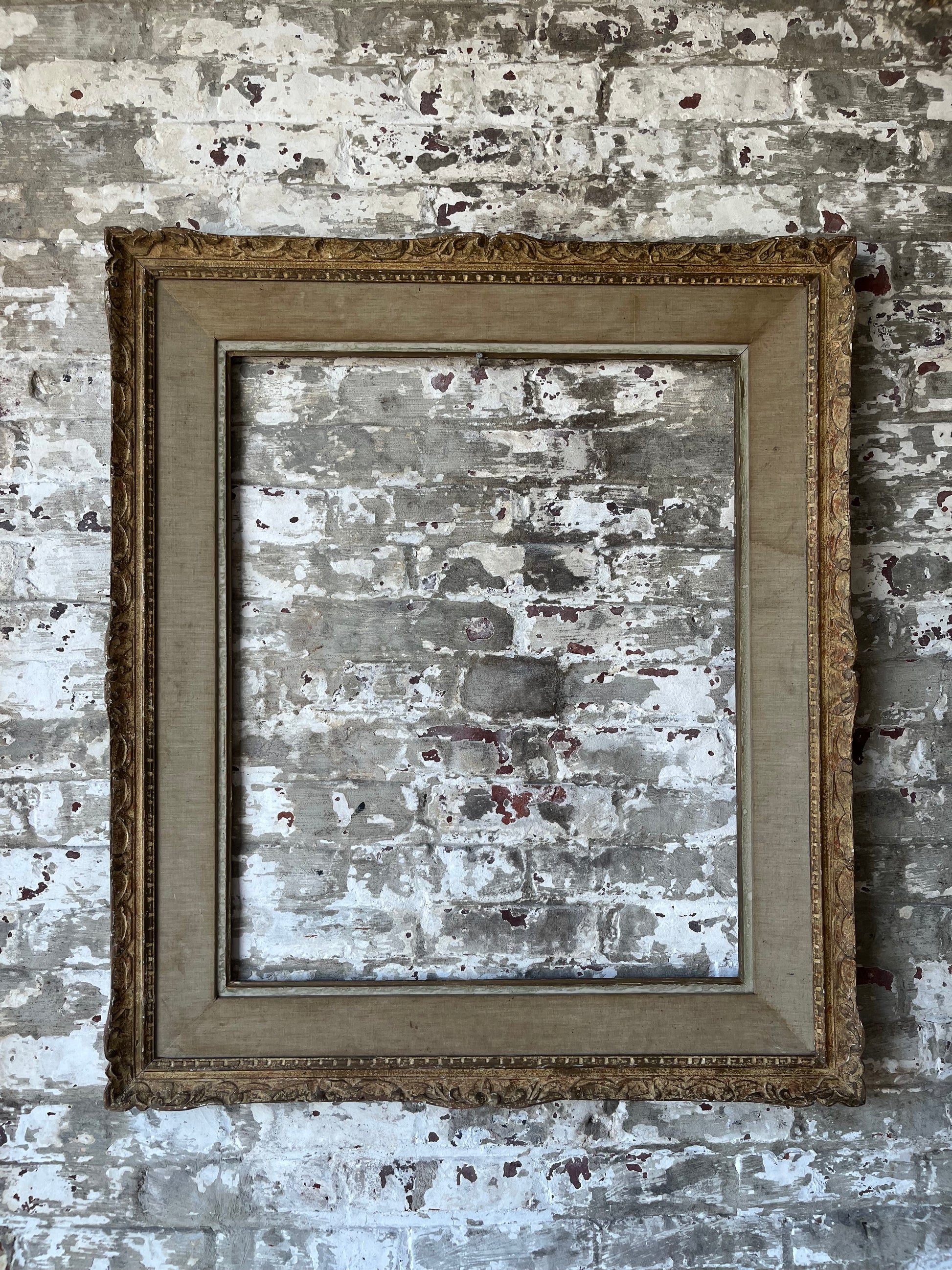 Elevate your artwork or mirror with this exquisite antique frame, hand-sourced in Paris. Featuring ornate carved detailing along the gilded edge and a wide linen-wrapped liner, this piece exudes timeless French elegance and patina-rich character.