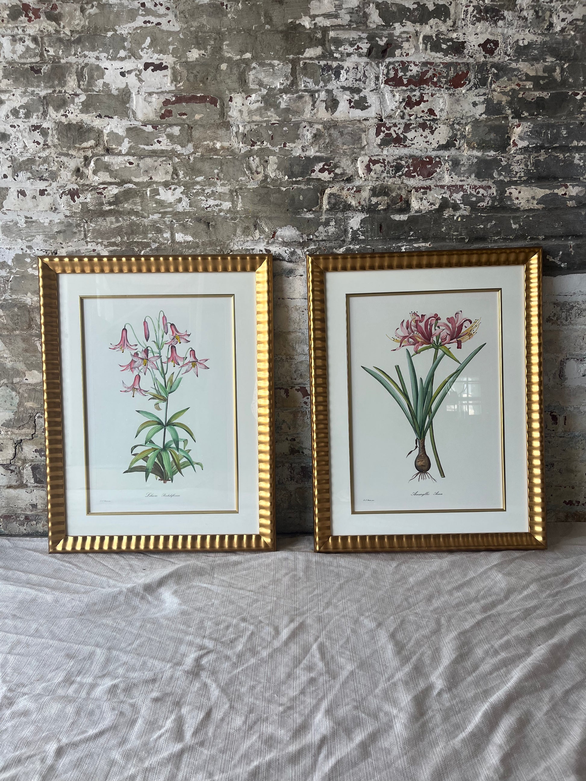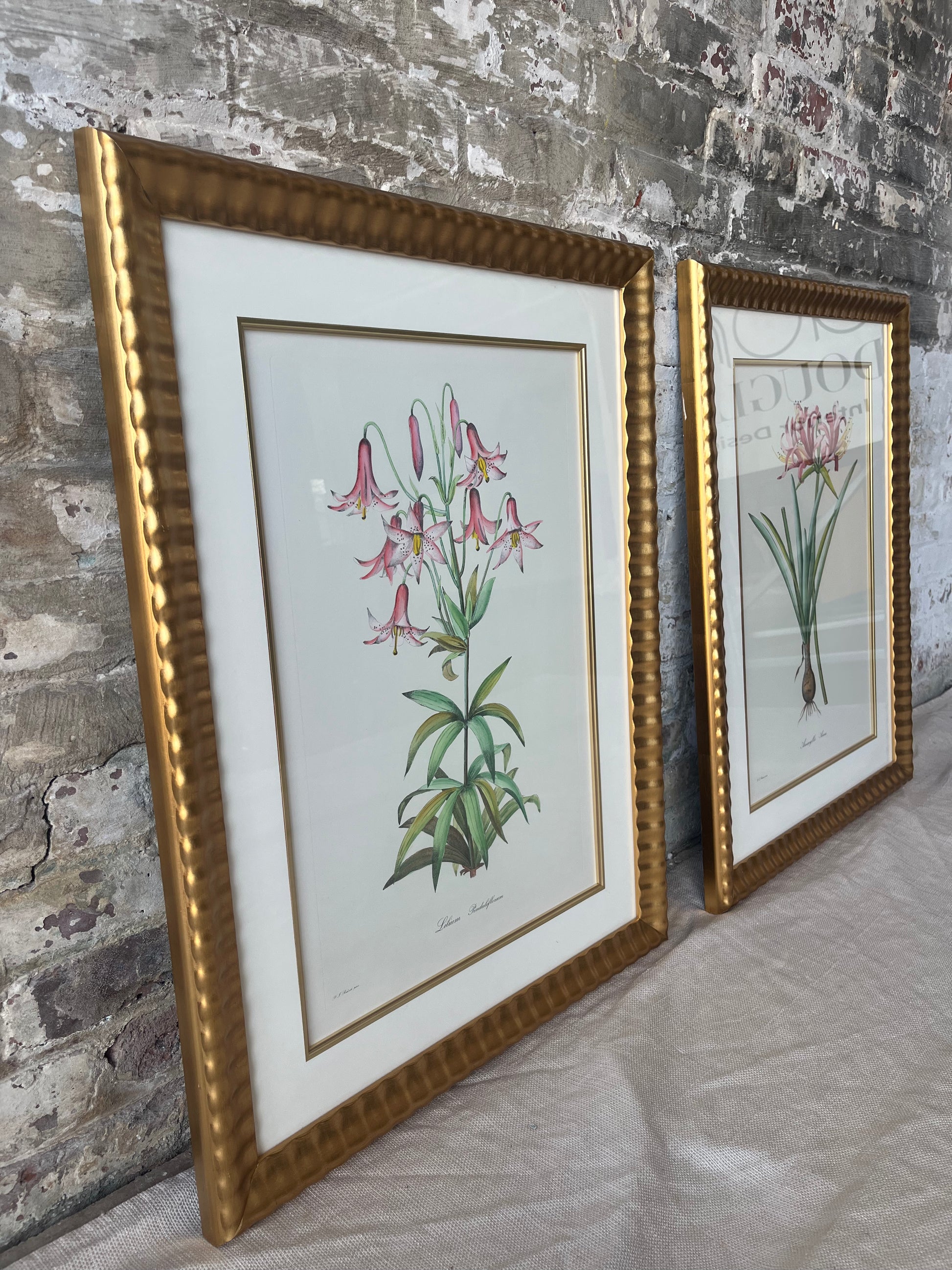 Enhance your space with this stunning set of two vintage botanical prints, each elegantly framed in gold. These beautiful illustrations depict delicate floral species with exquisite detail, adding a touch of classic charm to any room. The prints are double-matted with cream and gold accents, complementing the textured gold frames.