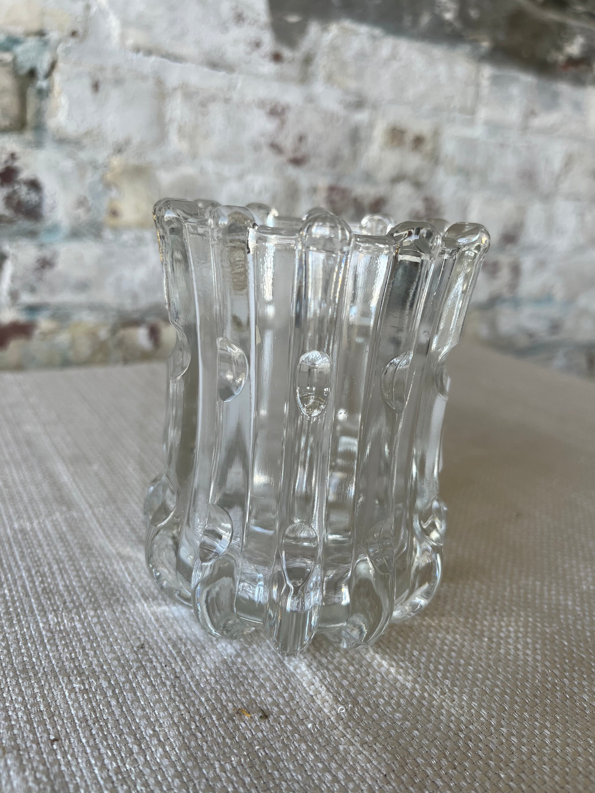 This beautifully sculpted clear glass vessel features vertical ribbing with a unique bubble-dot design and fluted, scalloped edges. The weighty, high-quality construction and intricate detailing suggest mid-century or early vintage production. Its versatile size makes it perfect as a votive candle holder, toothpick holder, or mini vase for single stems.
