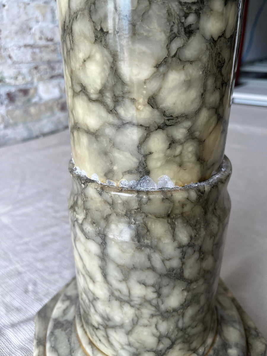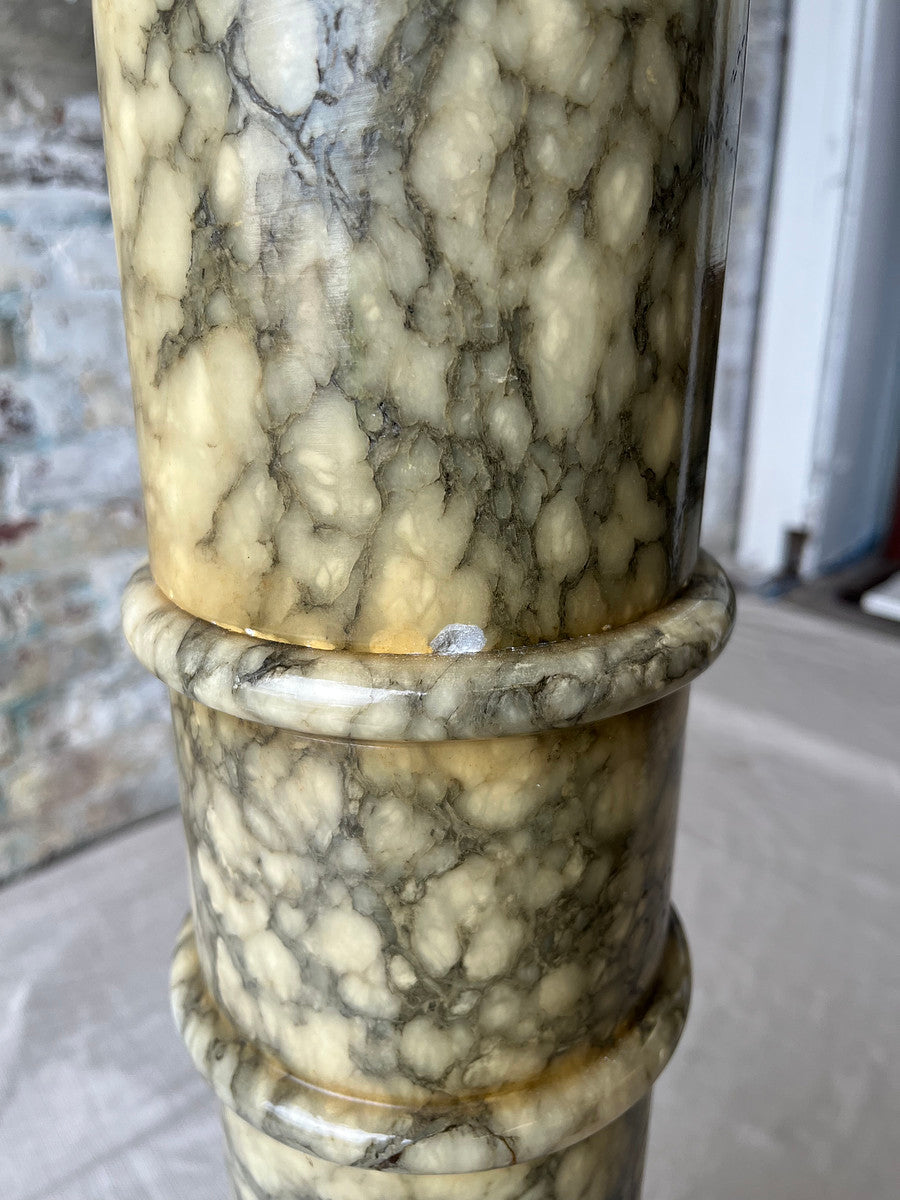 Elevate your space—literally. This striking vintage pedestal is carved from richly veined Verde Alpi marble, a dramatic green-grey stone with cream marbling that adds instant grandeur. Its classic column form is capped with a beveled square top and rests on an octagonal base, making it a sculptural display piece ideal for plants, busts, or standalone style.