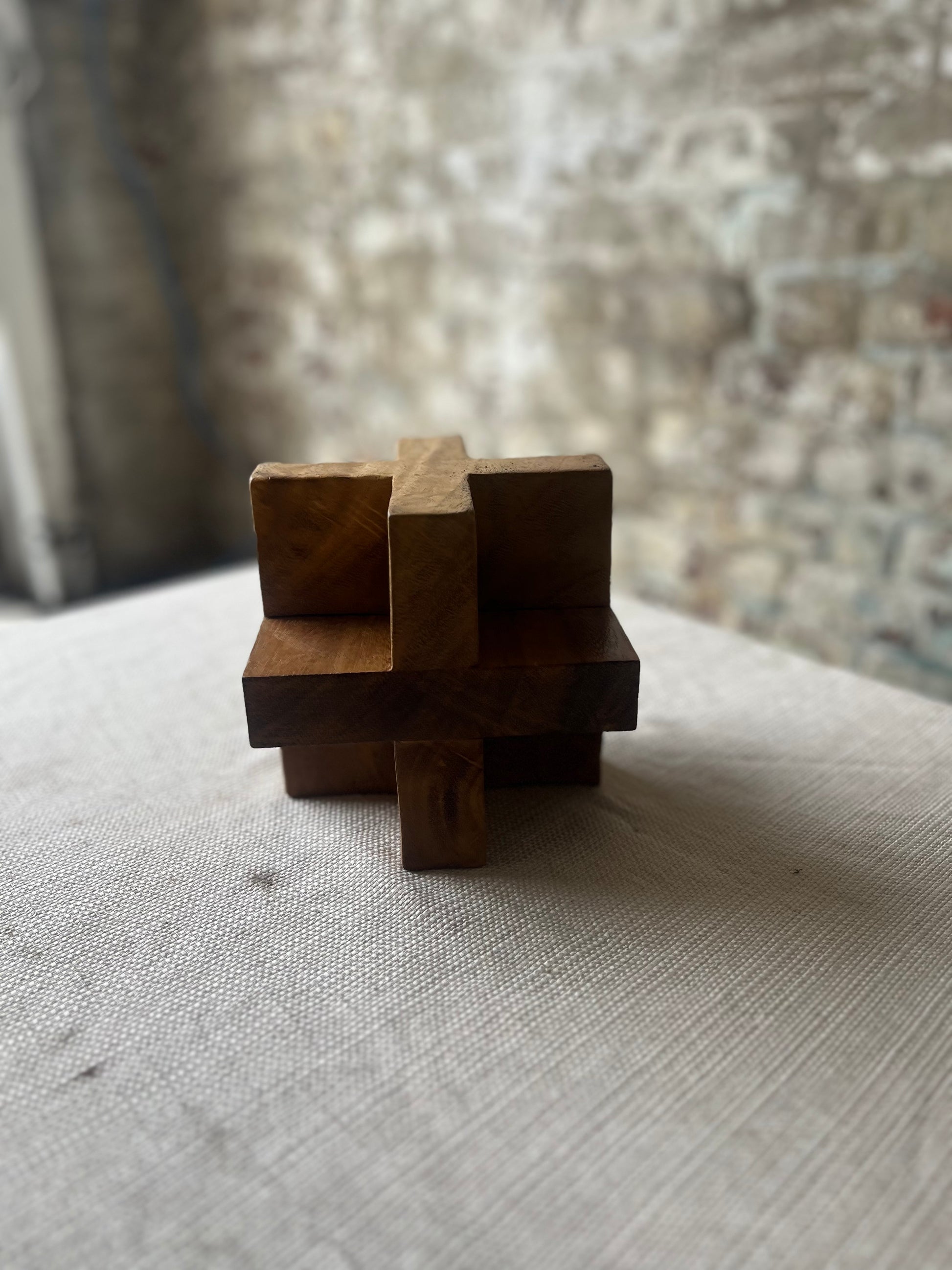 This piece features a clever geometric design made from solid wood, with intersecting rectangular forms that fit together seamlessly. It serves both as a tactile brain-teaser and a sculptural accent, making it perfect for a coffee table, desk, bookshelf, or gift. The warm wood grain and clean lines suit modern, rustic, Scandinavian, or eclectic decor.